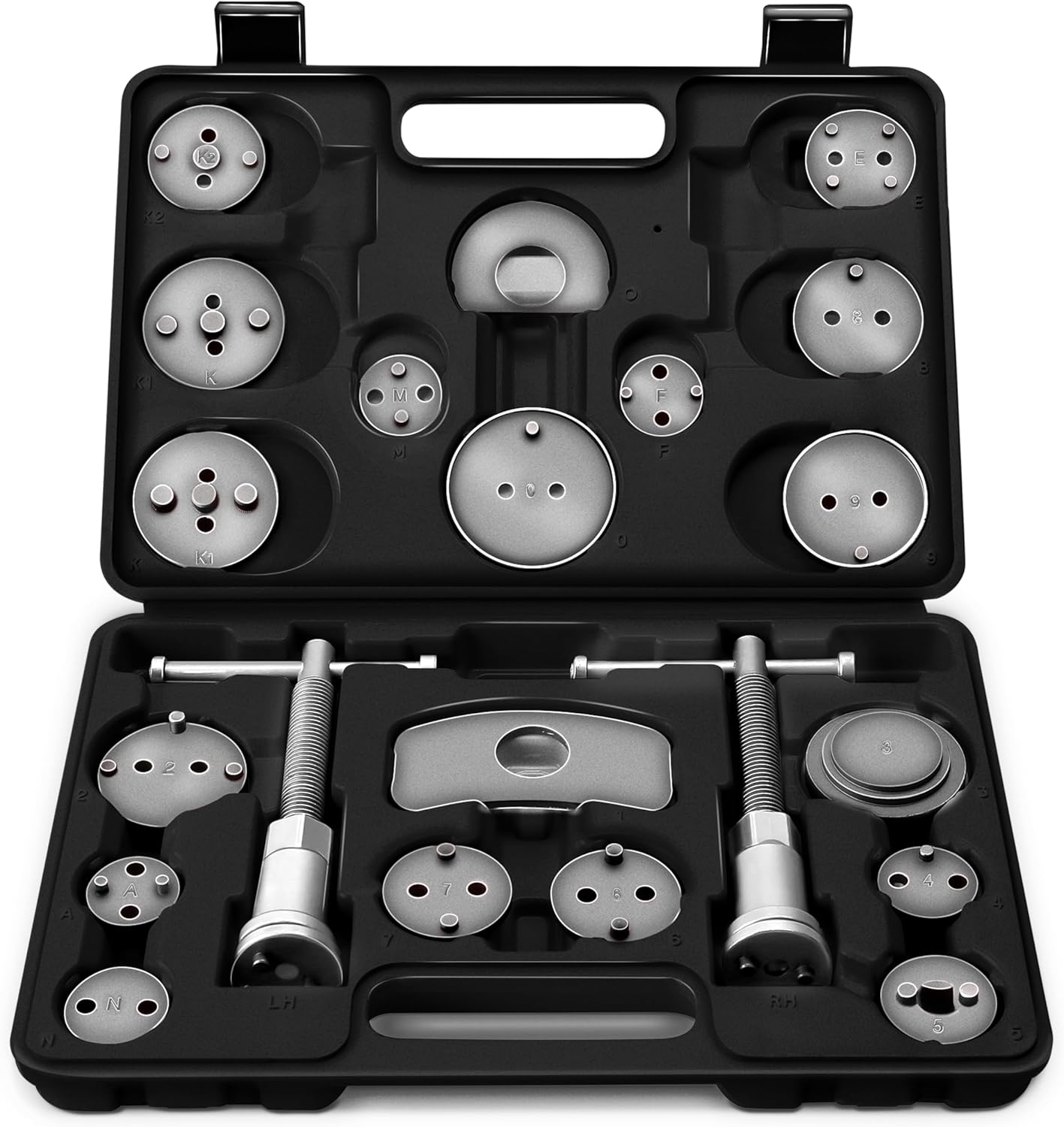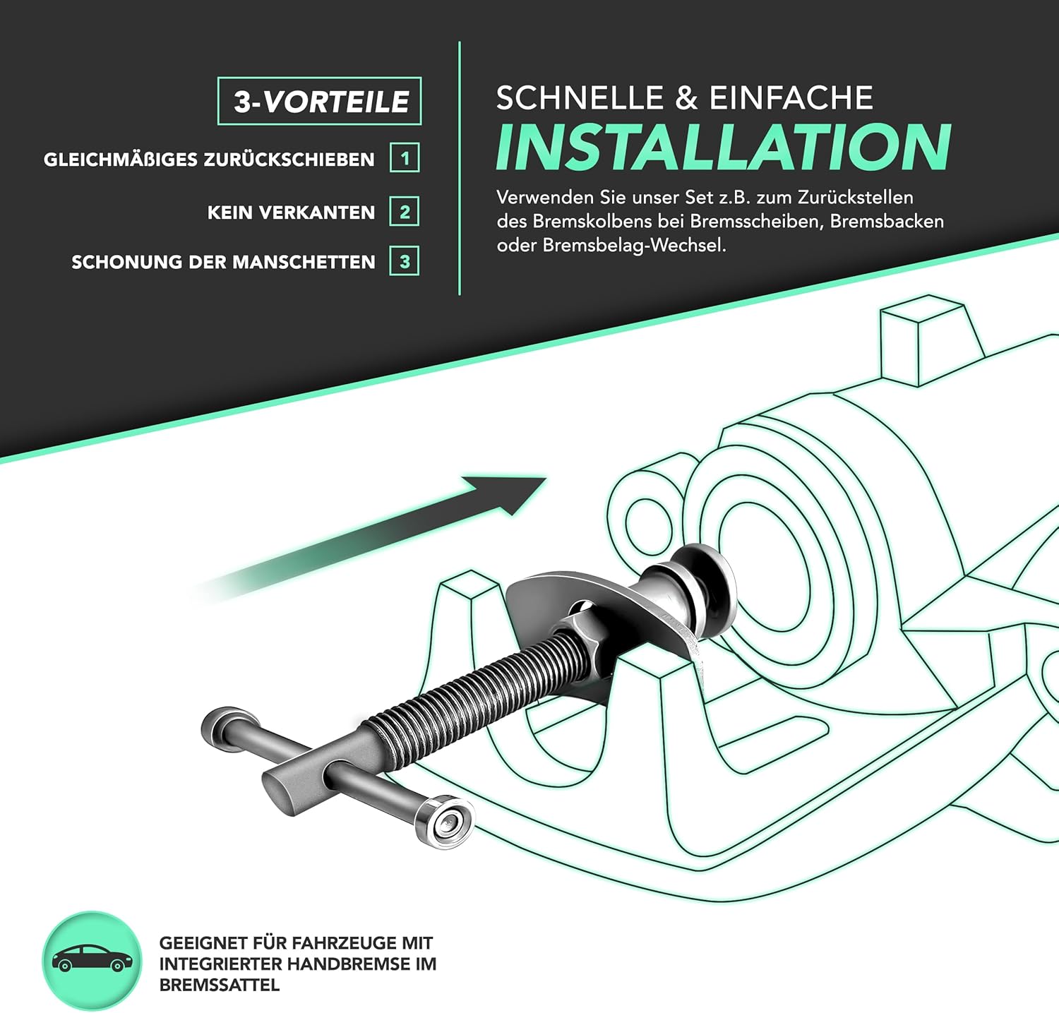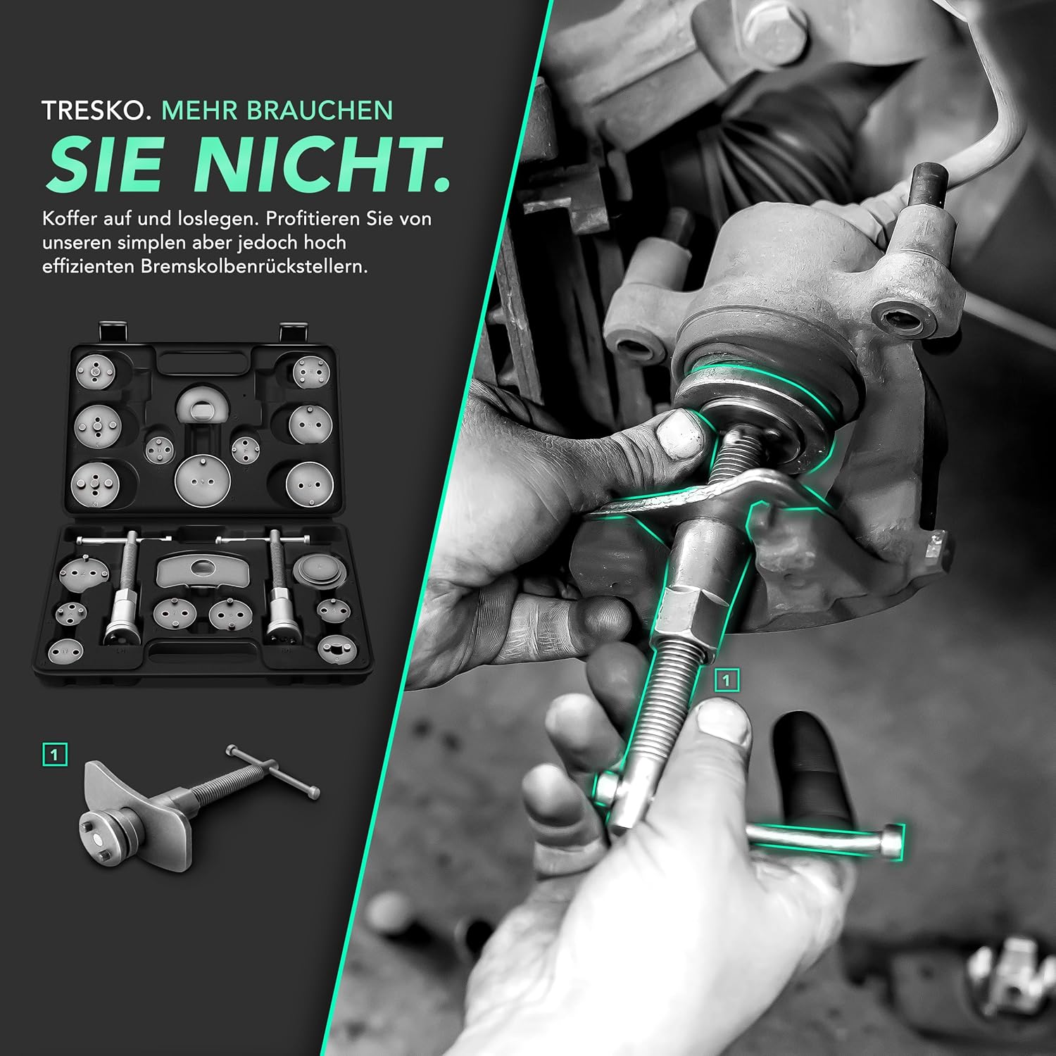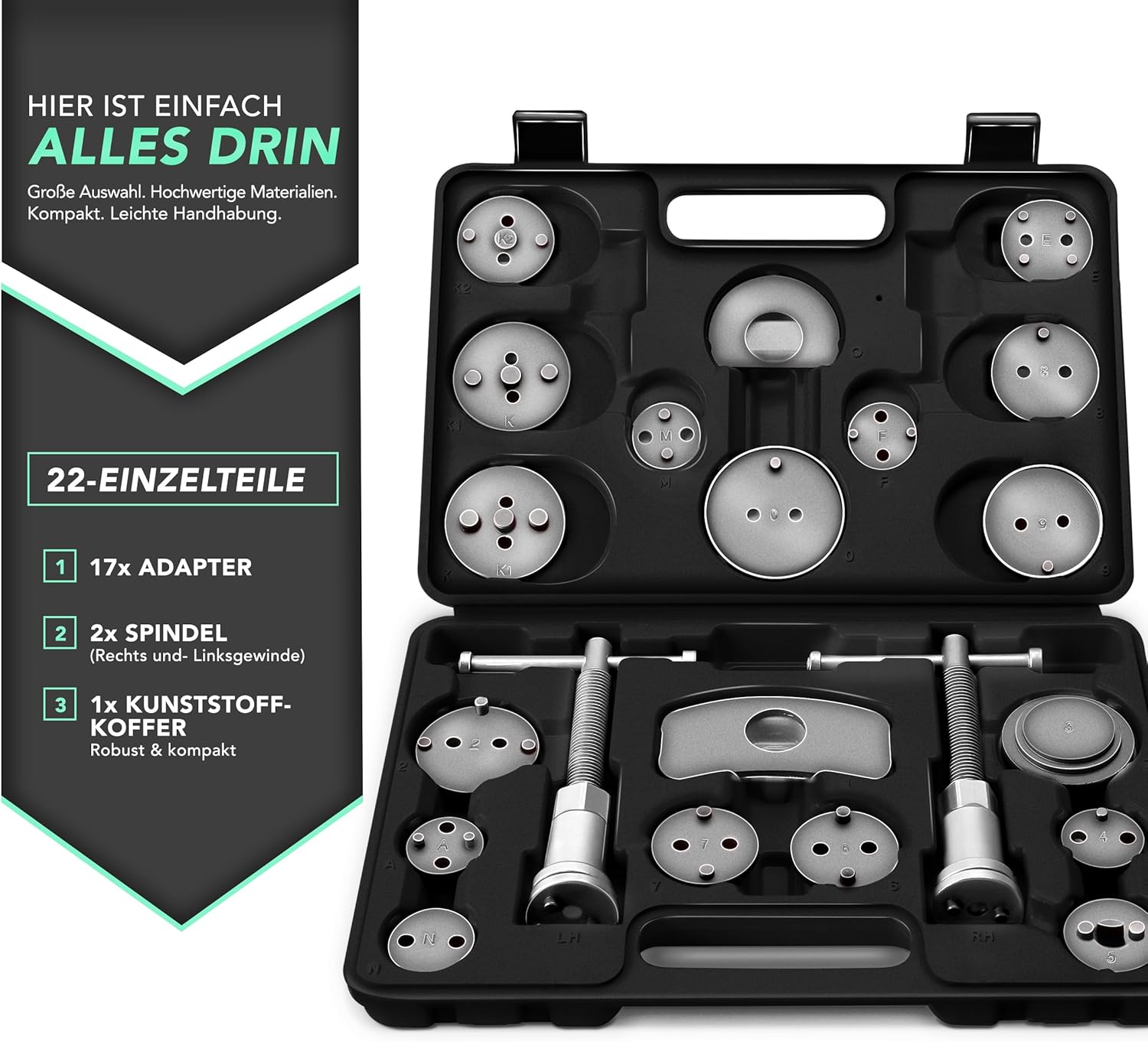 De remzuigerterugstelset bevat een spil met rechts- en linkse schroefdraad. De 17 remzuiger-adapterplaten kunnen bij bijna elke auto probleemloos en met weinig inspanning worden gebruikt voor het terugzetten van de remzuigers van gangbare remsystemen in de uitgangspositie.