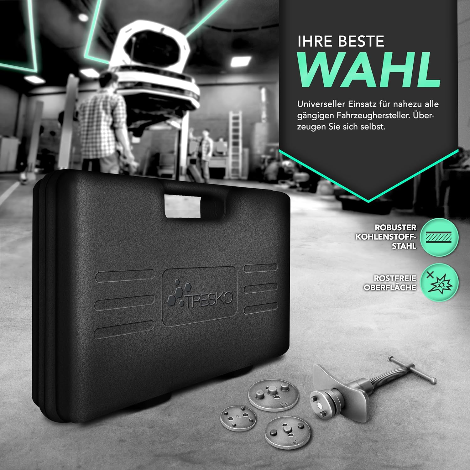 De robuuste Tresko remzuigerterugstelset heb je nodig om de remzuiger te resetten bij het vervangen van remschijven, remschoenen of remvoeringen. De met 22 delen zeer uitgebreide gereedschapsset voor auto's is universeel voor bijna alle gangbare voertuigfabrikanten inzetbaar. Deze set is vooral nodig voor voertuigen met geïntegreerde handrem in het remzadel, d.w.z. de handremkabel werkt direct op de zuiger van de schijfrem.