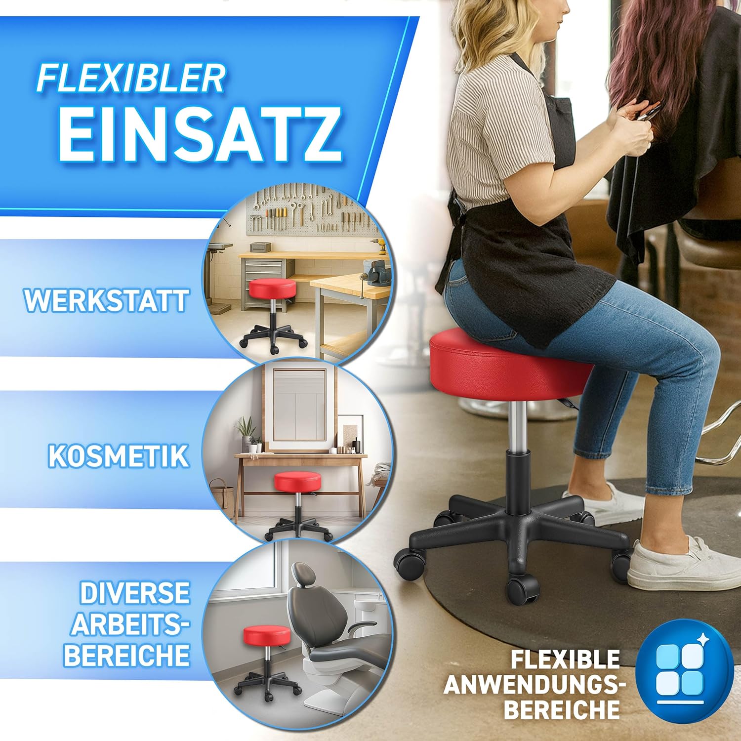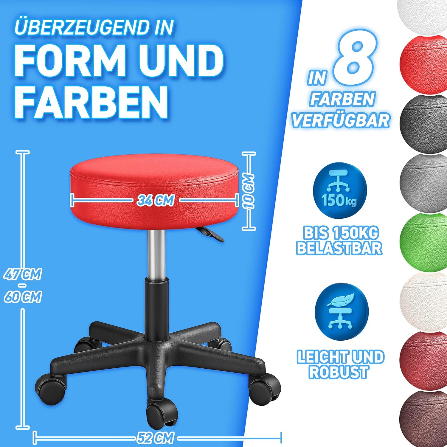 Robuust, klassiek en modern design, traploos in hoogte verstelbaar (van 47 tot 60 cm), 360 graden draaibaar, 10 cm dik gevoerde zitting, elastisch kunstleer, overtrekxtra brede kruisvoet voor een stabiele grip, met 5 veiligheidsrollen, afwasbaar, gemakkelijk te reinigen, duurzaam kunstleer, bekleding hoogste kwaliteit, universeel inzetbaar