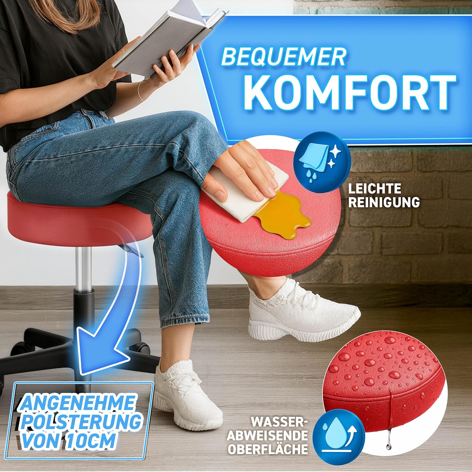 Dankzij de 10 cm dikke bekleding biedt de kruk maximale flexibiliteit met aangenaam zitcomfort. De zitting is bekleed met onderhoudsvriendelijk en duurzaam kunstleer. Daardoor kan het oppervlak snel en eenvoudig worden gereinigd.