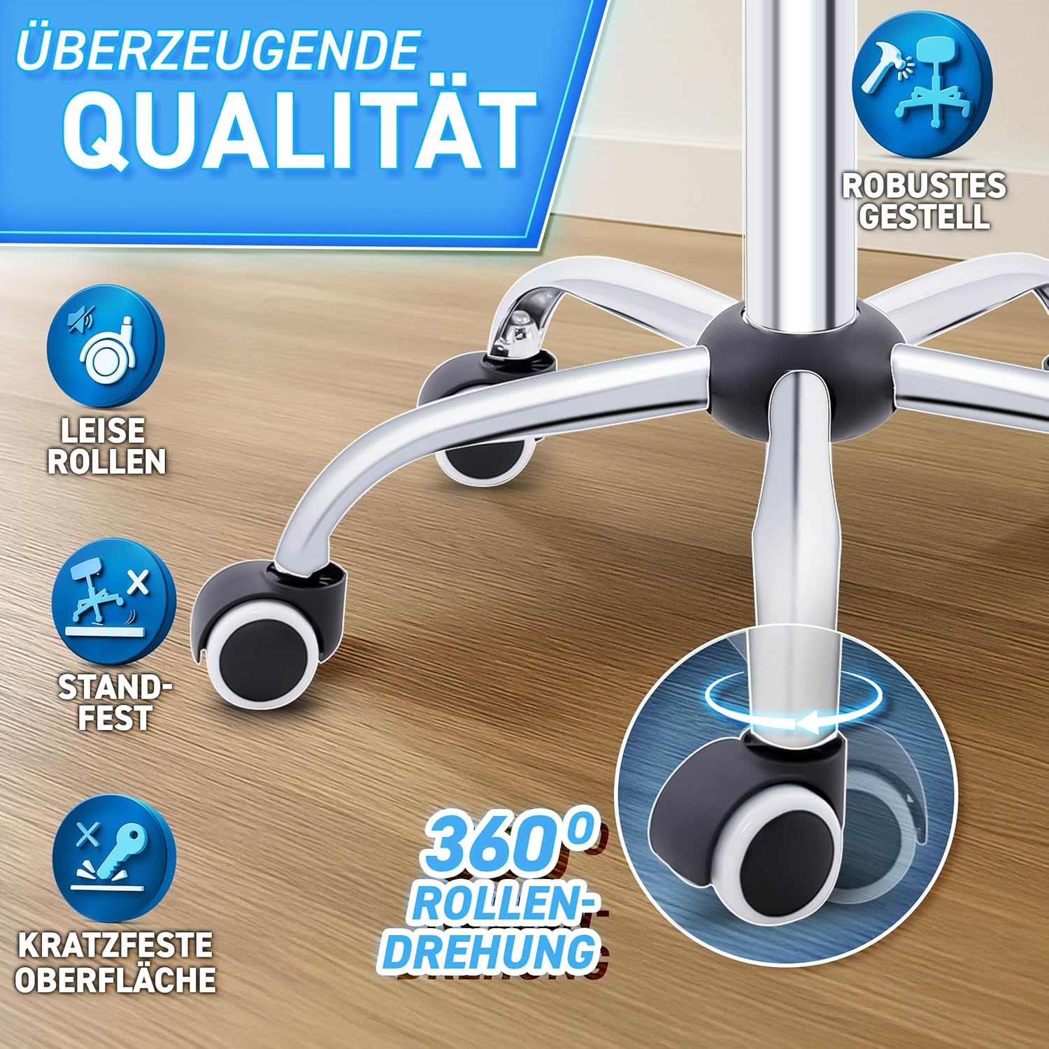 • Zeer stabiel: verchroomde kruisvoet en 5 veiligheidswielen. De zwenkwielen hebben een rand van hoogwaardig PU, zijn slijtvast en zeer stil. De vloer wordt bovendien beschermd tegen krassen.