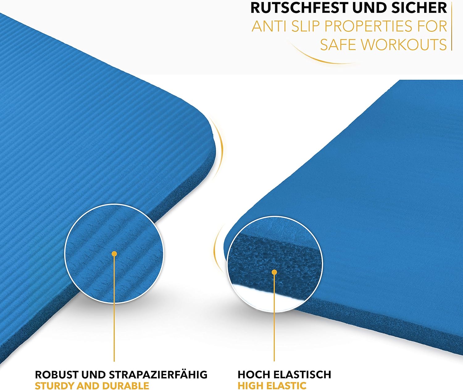 De fitnessmat / yogamat / gymnastiekmat / sportmat is afwasbaar, geeft extra gewrichtsbescherming, is huidvriendelijk, antislip en duurzaam. NBR-schuimrubber zonder schadelijke stoffen zorgt voor een aangenaam gevoel op de huid.