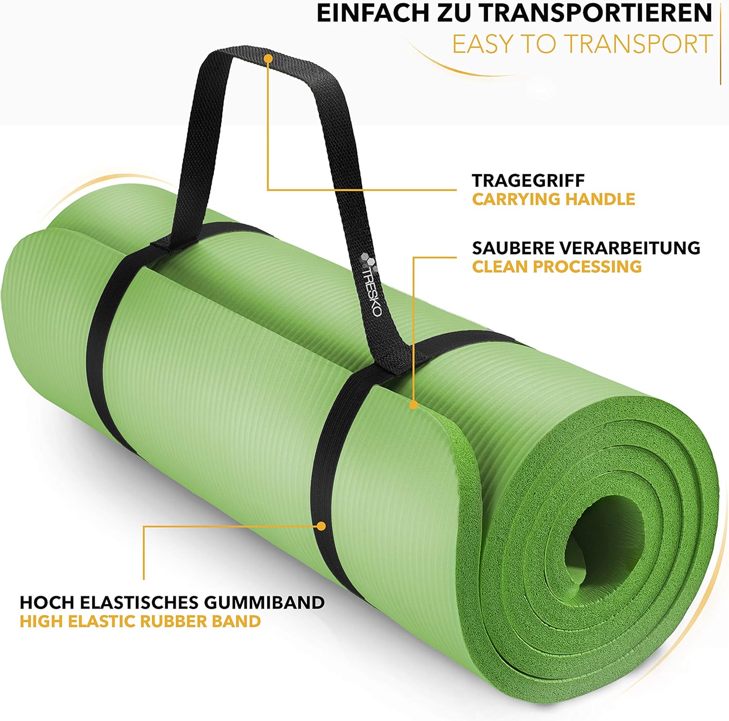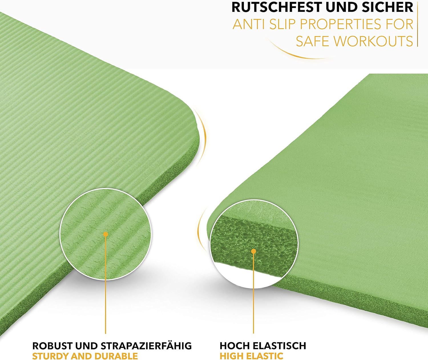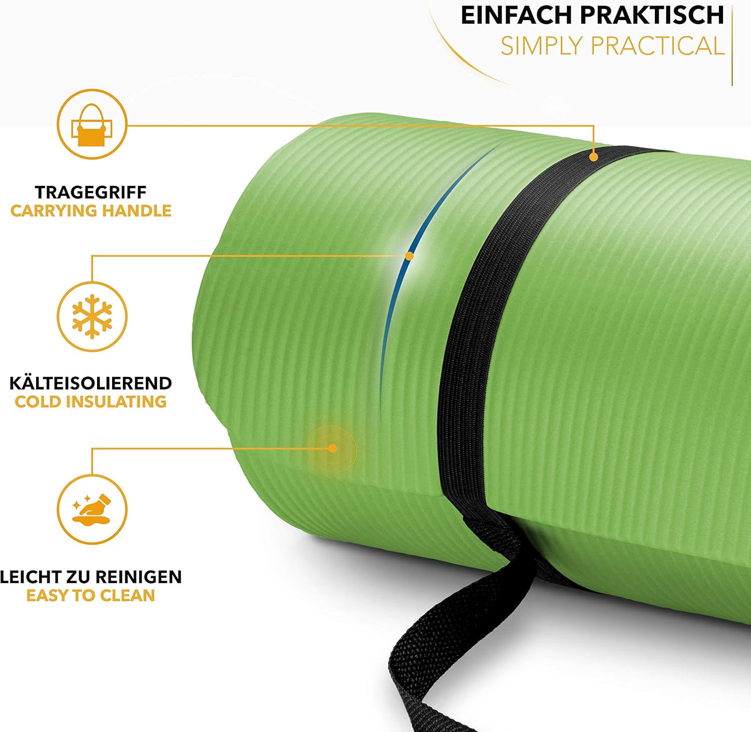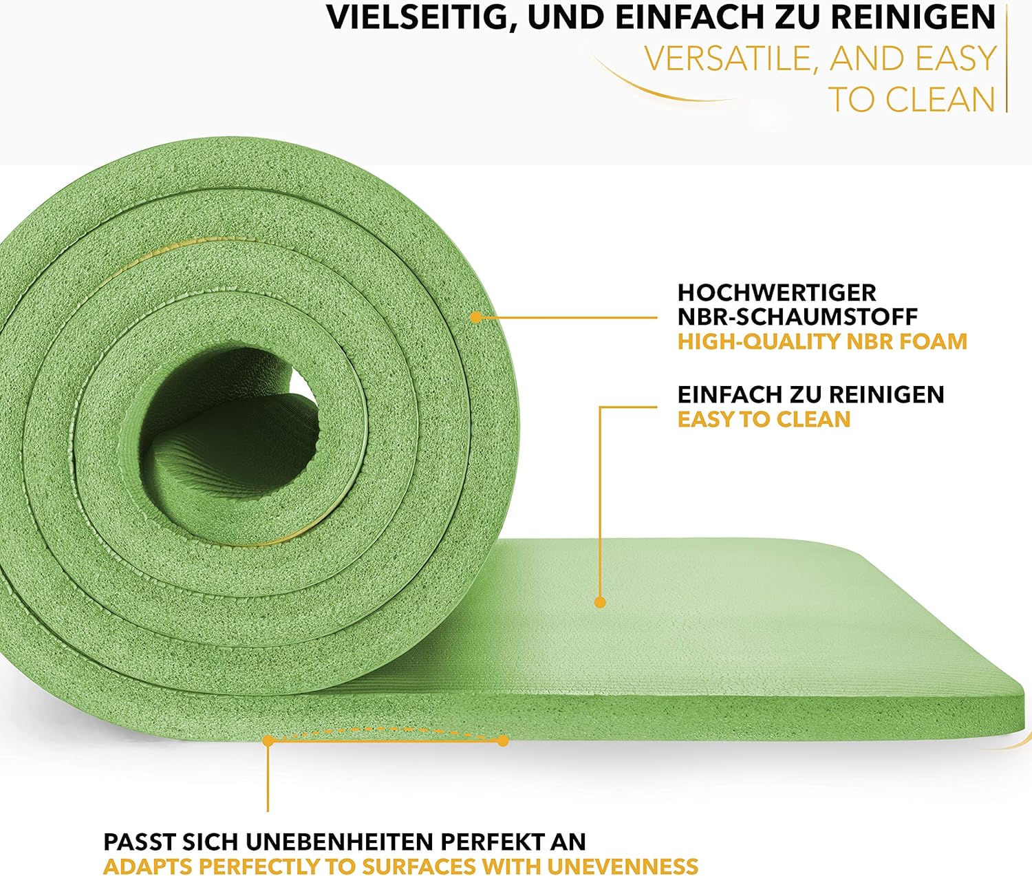 De fitnessmat / yogamat / gymnastiekmat / sportmat is afwasbaar, geeft extra gewrichtsbescherming, is huidvriendelijk, antislip en duurzaam. NBR-schuimrubber zonder schadelijke stoffen zorgt voor een aangenaam gevoel op de huid.