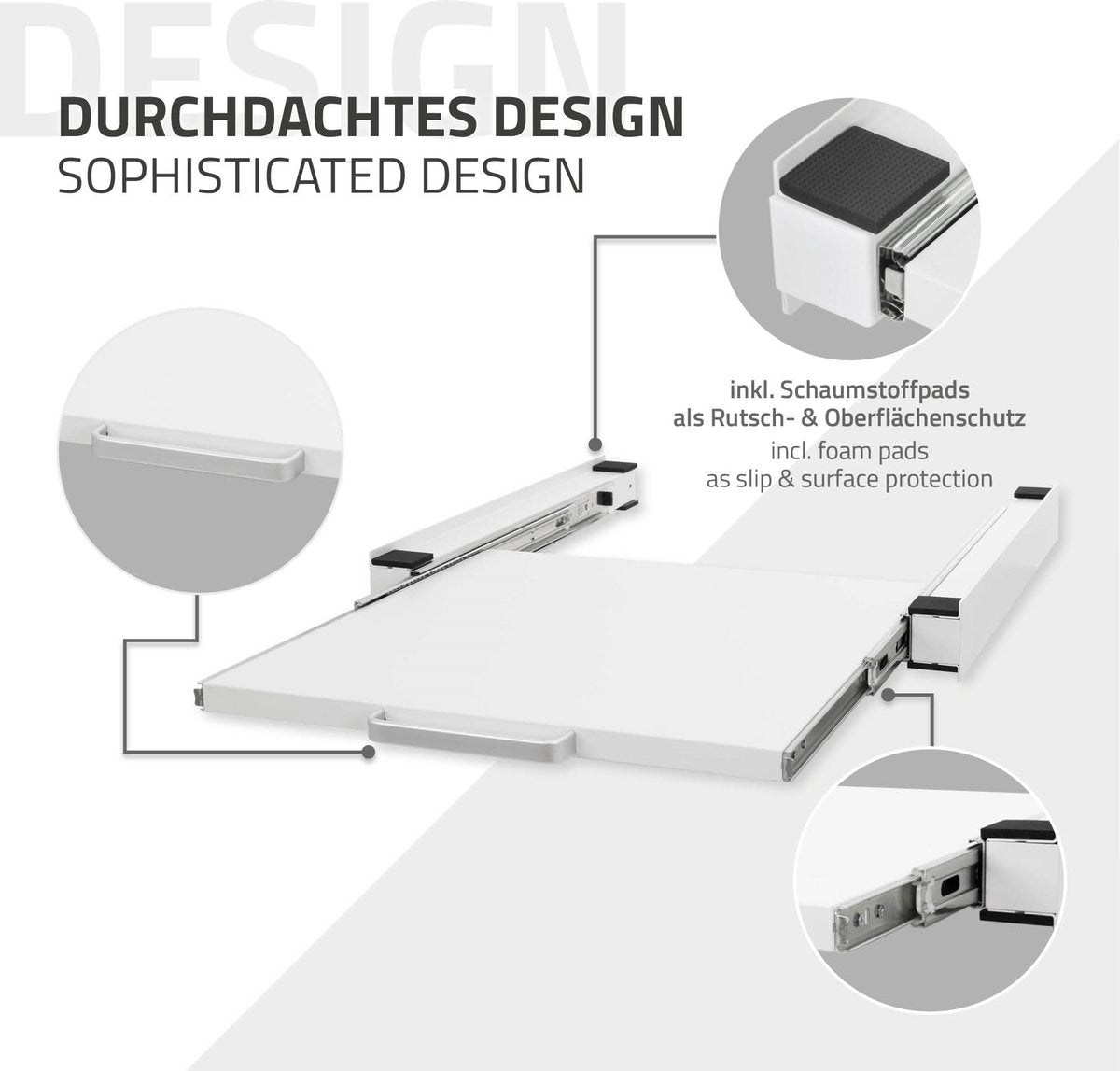 De uitschuifbare plank voor wasmachines van gepoedercoat staal is een praktische en duurzame gadget die u meer ruimte en orde geeft in uw wasruimte. Met zijn uittrekbare plank is het een grote hulp en bijzonder ruimtebesparend. Dankzij het rek kunt u uw wasmand comfortabel op werkhoogte plaatsen en zo rugvriendelijk en ergonomisch werken. Deze tussenplank is gemakkelijk te installeren en geeft u extra opbergruimte wanneer u de was doet. De tussenplank wordt tussen de wasmachine en de droger geplaatst. Het heeft geen invloed op de stabiliteit van de twee wasmachines. Het verbindingsframe is door zijn afmetingen universeel inzetbaar en past op bijna elke wasmachine en droger.
