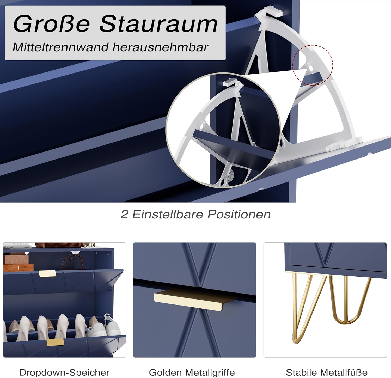 - Uniek uiterlijk: de combinatie van de effen lak, de gouden handgrepen, benen en het strakke lijnpatroon laat de schoenenkast er modern en stijlvol uitzien en maakt hem tot een echte blikvanger in elke ruimte.