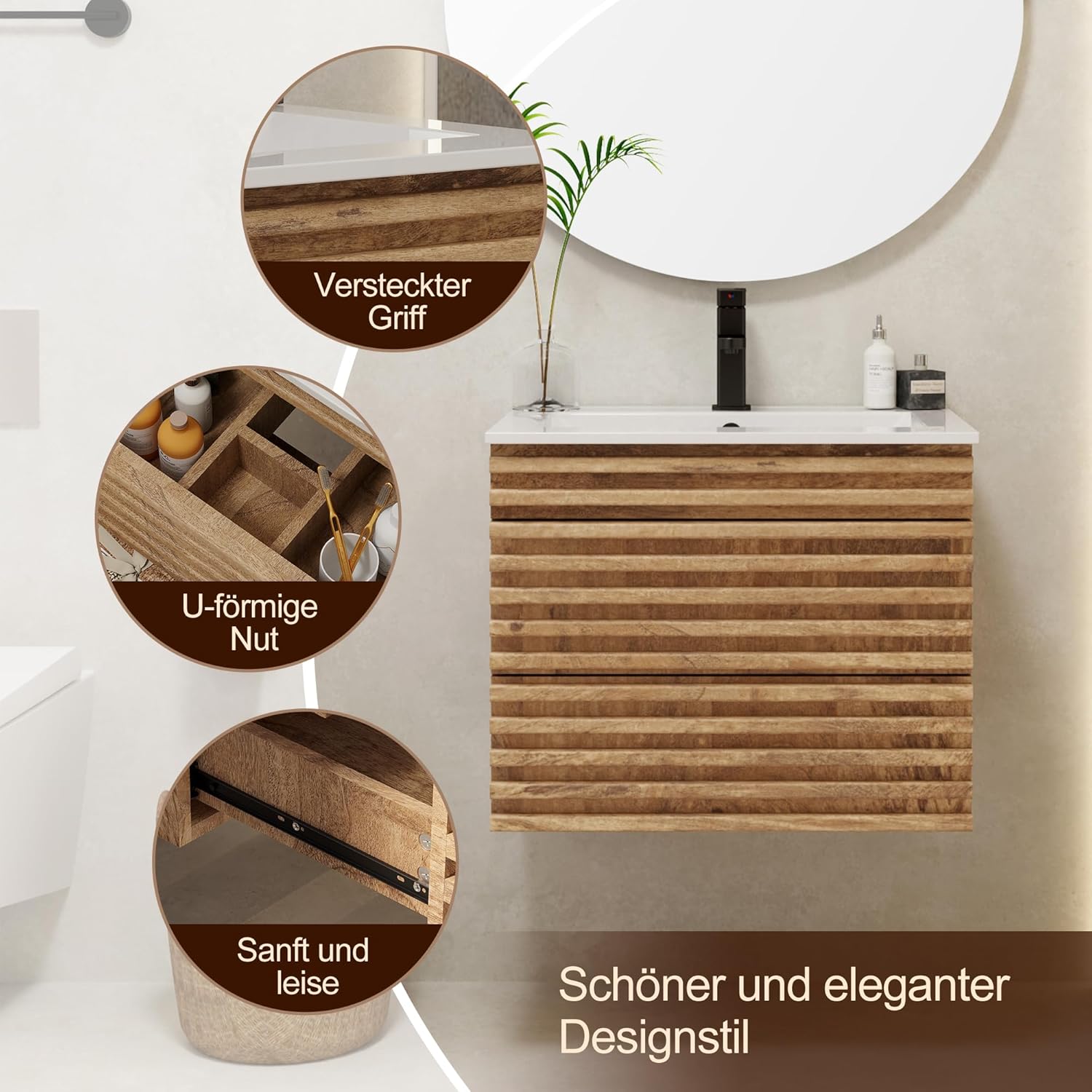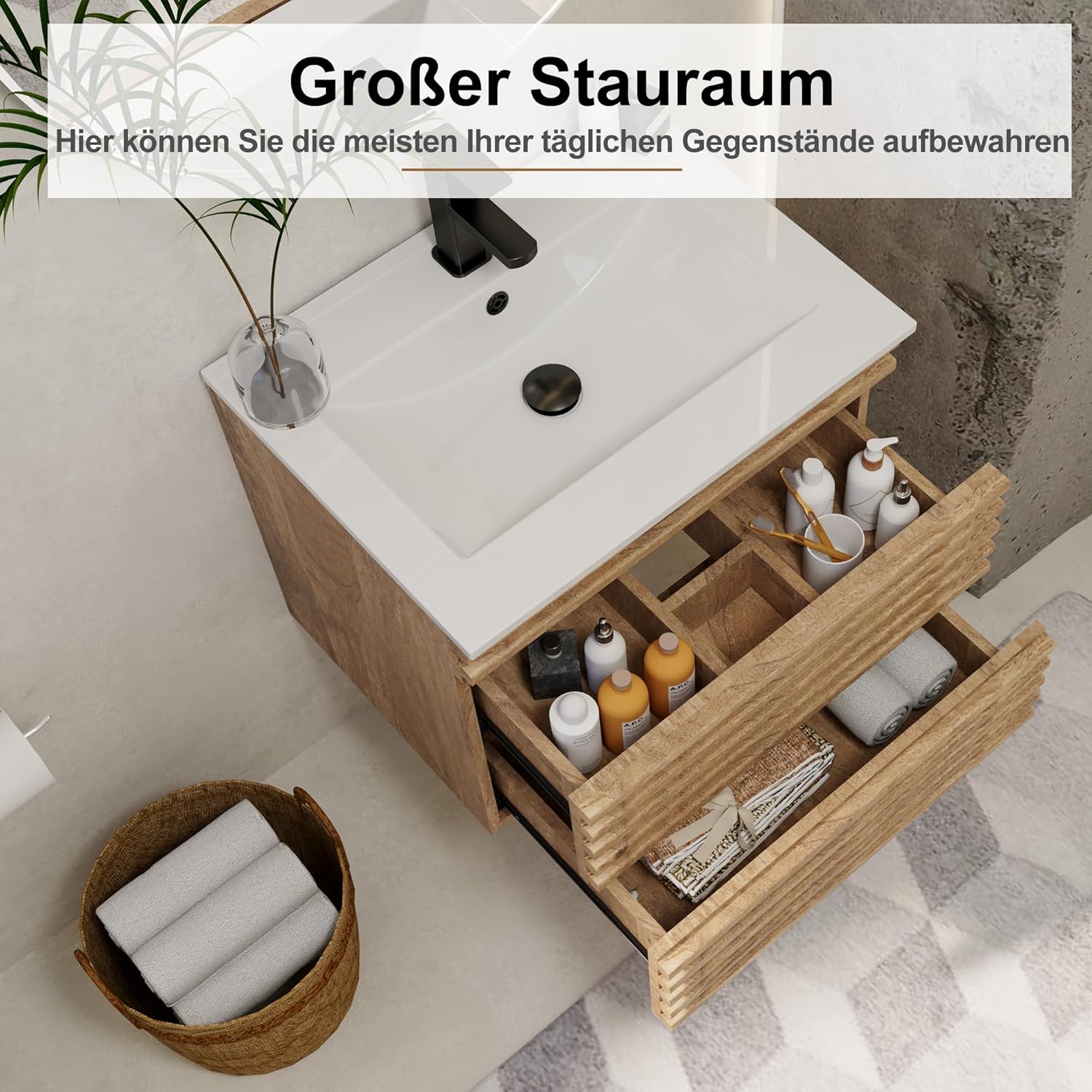 UEV Wastafelonderkast hangend 60 cm, badkamerkast met 2 laden, soft-close-systeem, onderkast voor badkamer, wasplaats, wastafelonderkast, badkamermeubel voor gastentoilet, natuur