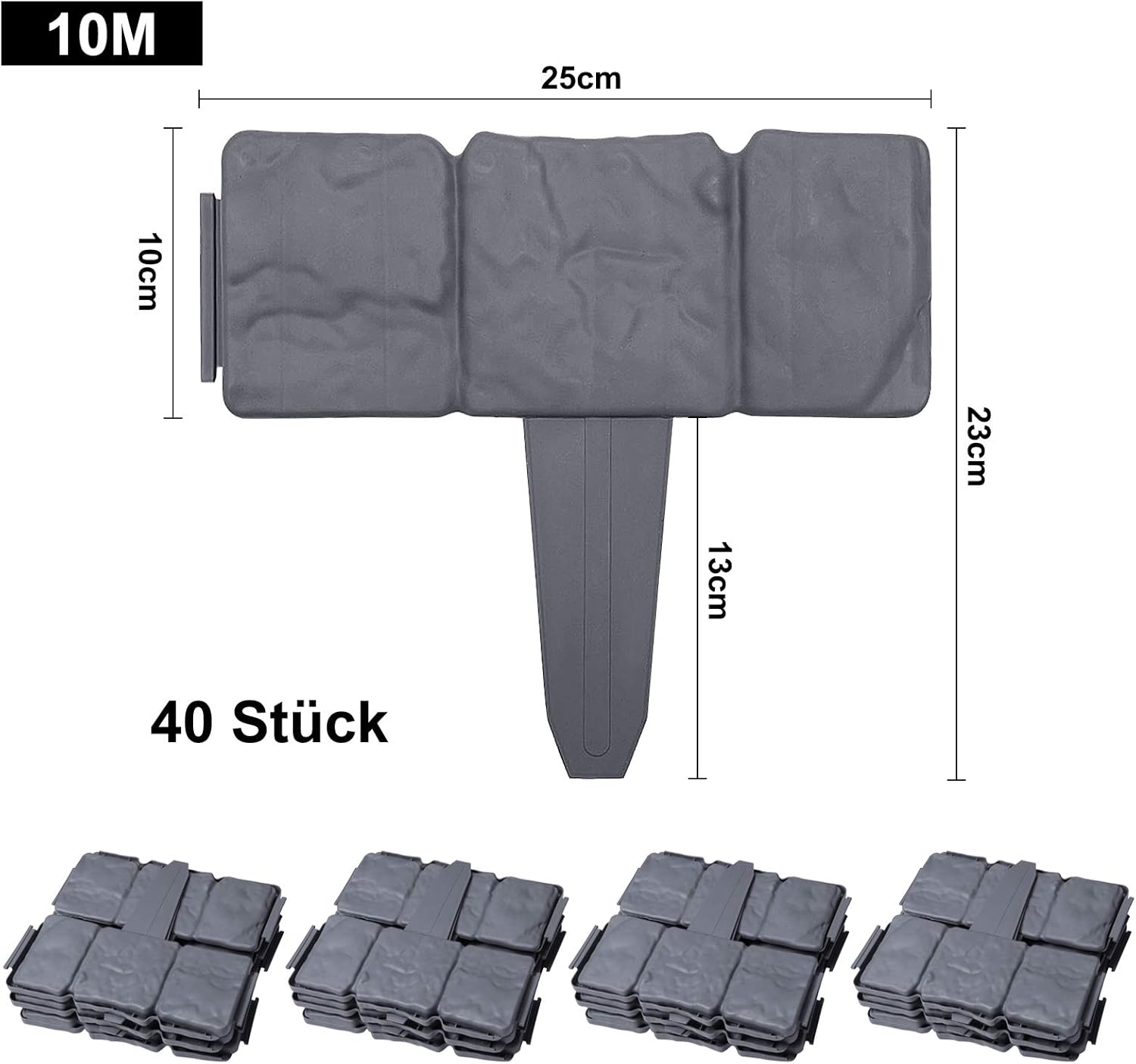 Flexibel en uitbreidbaar: de afmetingen van een borderrandelement zijn 25 x 23 cm (l x h). De set bestaat uit 40 elementen, met een totale lengte van ongeveer 10 m. Je kunt naar wens een rechte, ronde of rechthoekige bloembak maken.