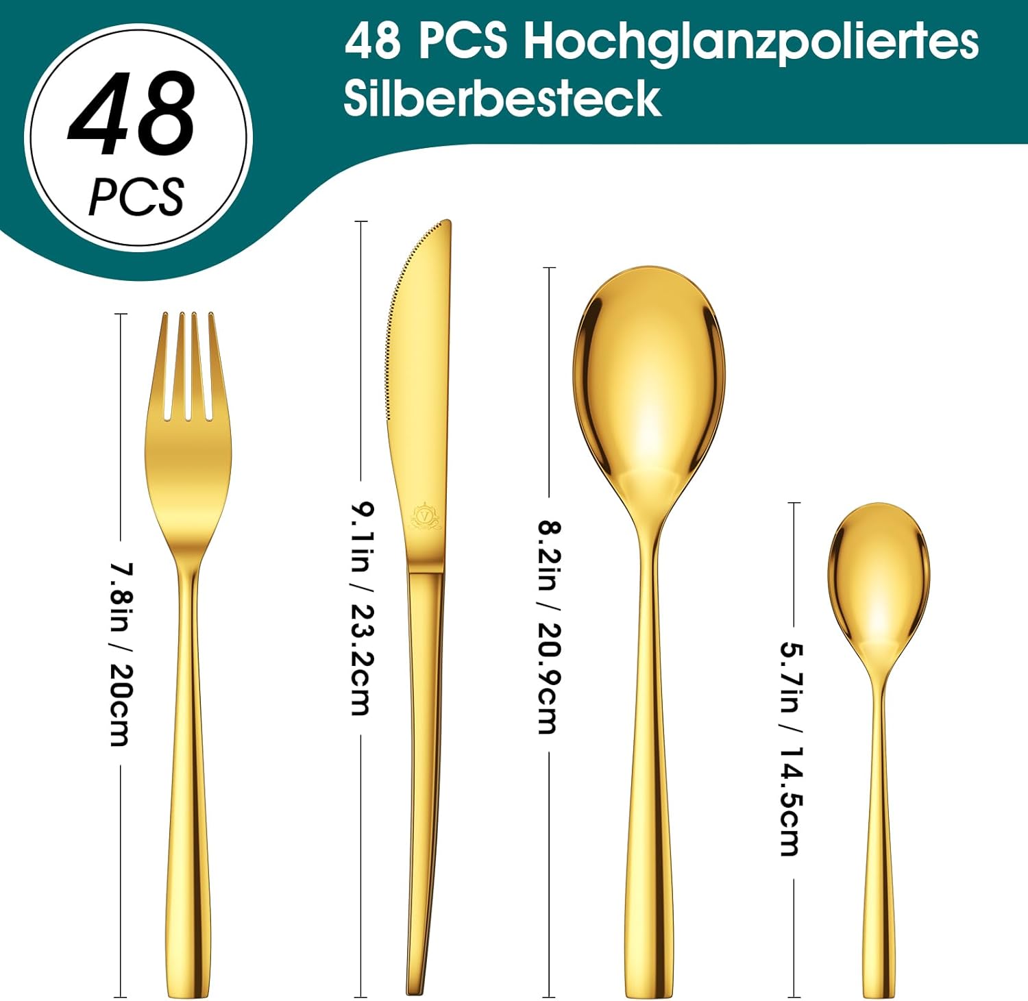 Bestekset voor 12 personen: de vancasso gouden bestekset 48-delig bevat 12 dinervorken, 12 dinermessen, 12 dinelepels en 12 dessertlepels. De grootte en het gewicht zijn optimaal, elk mes, elke vork en elke lepel is goed uitgebalanceerd en aangenaam in het gebruik. Het elegante gouden oppervlak geeft je tafel een klassieke en chique glans. Deze bestekset is perfect voor dagelijks gebruik, diner of feestelijke gelegenheden.