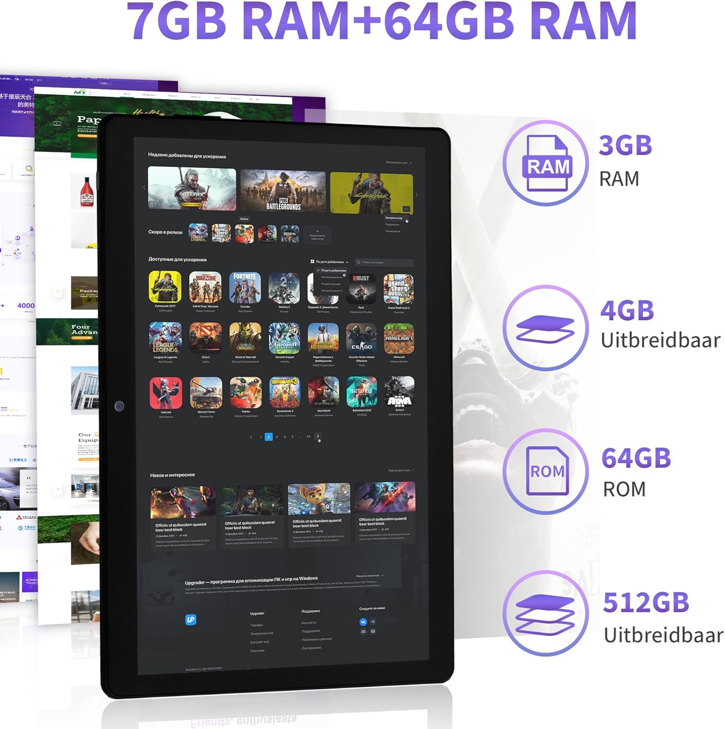 7 (3+4) GB RAM + 64 GB ROM: 3 GB fysiek RAM + 4 GB virtueel geheugen voor krachtige multitasking. 64 GB interne opslagruimte uitbreidbaar tot 512 GB. Innovatief virtueel geheugen verbetert de efficiëntie en prestaties van de tablet