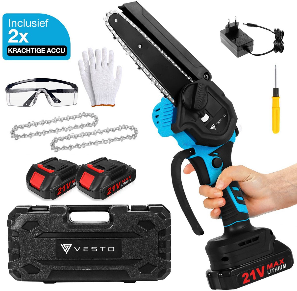 Daarnaast wordt de kettingzaag geleverd met een handige beschermkap, zodat je veilig kunt werken en jezelf kunt behoeden voor mogelijke ongelukken. De Vesto© Mini Kettingzaag wordt geleverd in een handige koffer, zodat je alles netjes kunt opbergen en meenemen naar elke klus. Geen losse onderdelen die kwijt kunnen raken. Met deze complete set heb je alles binnen handbereik om direct aan de slag te gaan. Met deze complete set ben je direct klaar om aan de slag te gaan!