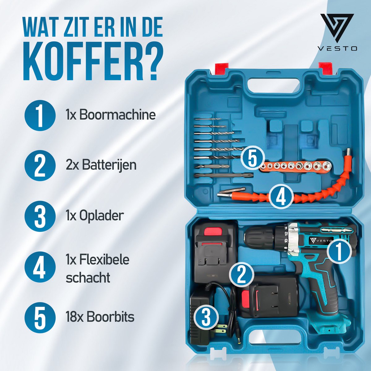 Uitgebreide Accessoire Set: Met de Vesto® PowerDrive ontvang je een complete set accessoires, waaronder 18 boren, 1 verlengstang, 1 flexibele zeskantschacht, 1 draagtas, 1 oplader en 2 batterijen. Deze uitgebreide kit zorgt ervoor dat je alles hebt wat je nodig hebt om een breed scala aan taken met gemak en precisie aan te pakken.