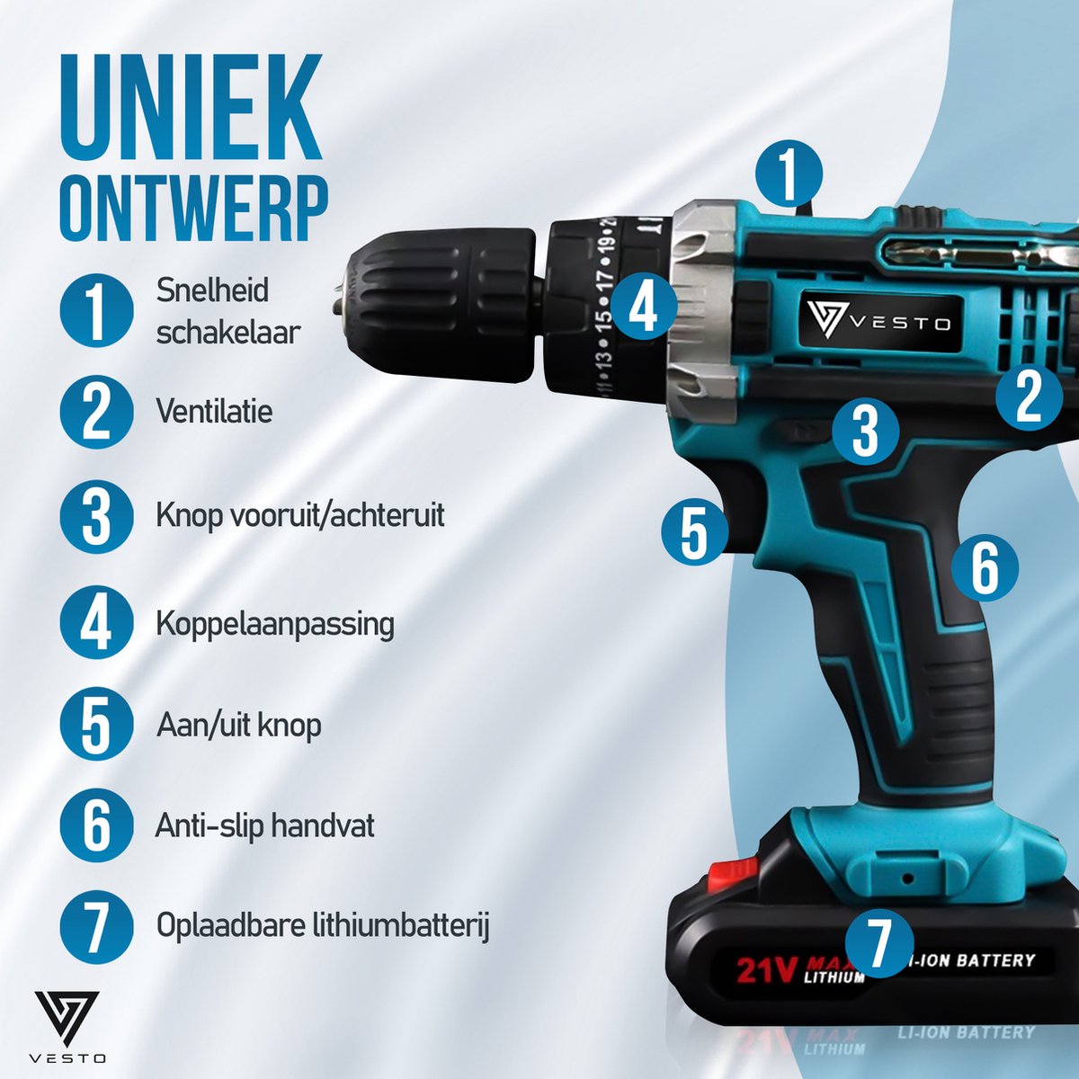 Comfort en Gemak: De Vesto® PowerDrive is ontworpen met jouw comfort in gedachten. Dankzij zijn ergonomische, schokbestendige grip en lichte constructie van slechts 1,3 kg, wordt vermoeidheid geminimaliseerd, zodat je comfortabel kunt werken gedurende lange periodes. De 3/8 inch (10 mm) zelfblokkerende boorkop maakt snelle bitwisselingen mogelijk, terwijl de ingebouwde LED-verlichting je werkruimte verlicht voor beter zicht, zelfs in slecht verlichte omgevingen.
