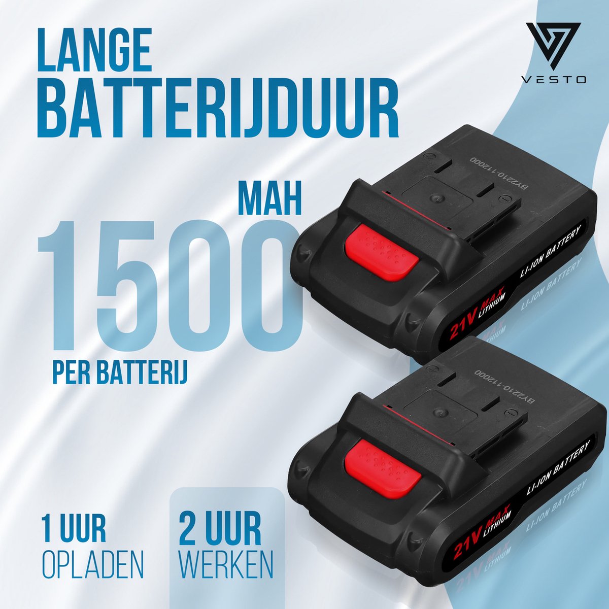 Lange Batterijduur: Uitgerust met 2x 1500 mAh lithium-ion batterijen, biedt elke volledig opgeladen batterij een indrukwekkende 2 uur continu gebruik. Met de meegeleverde snellader ben je binnen 1 uur weer klaar voor gebruik, wat zorgt voor minimale downtime en maximale productiviteit.