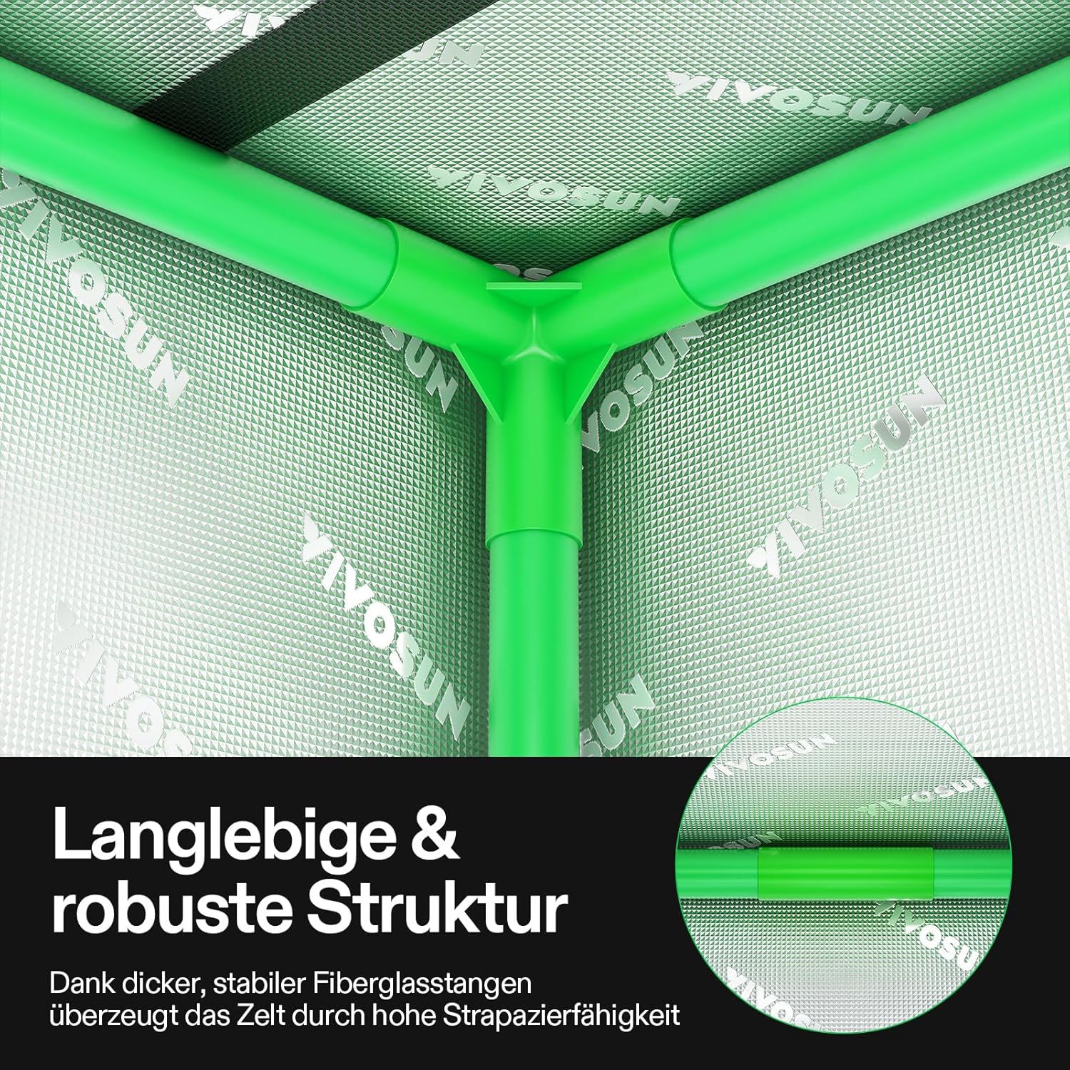 Robuuste structuur: ondersteund door dikke glasvezelstangen, verbeterde connectoren en hoogwaardige Oxford-stof, die scheurvast en dubbel genaaid is, biedt deze tent een buitengewone duurzaamheid en betere lichtcontrole. Bovendien is de hele binnenvoering niet giftig