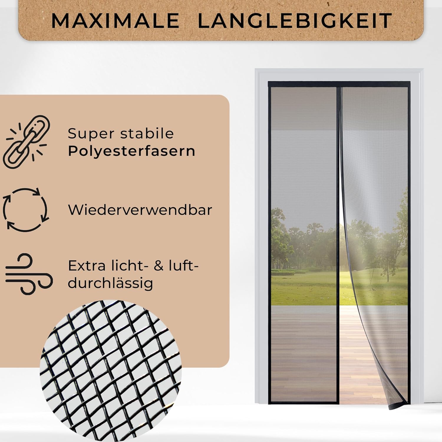 Extra robuust net: het polyesternet is dikker en robuuster dan de netten van conventionele hordeuren