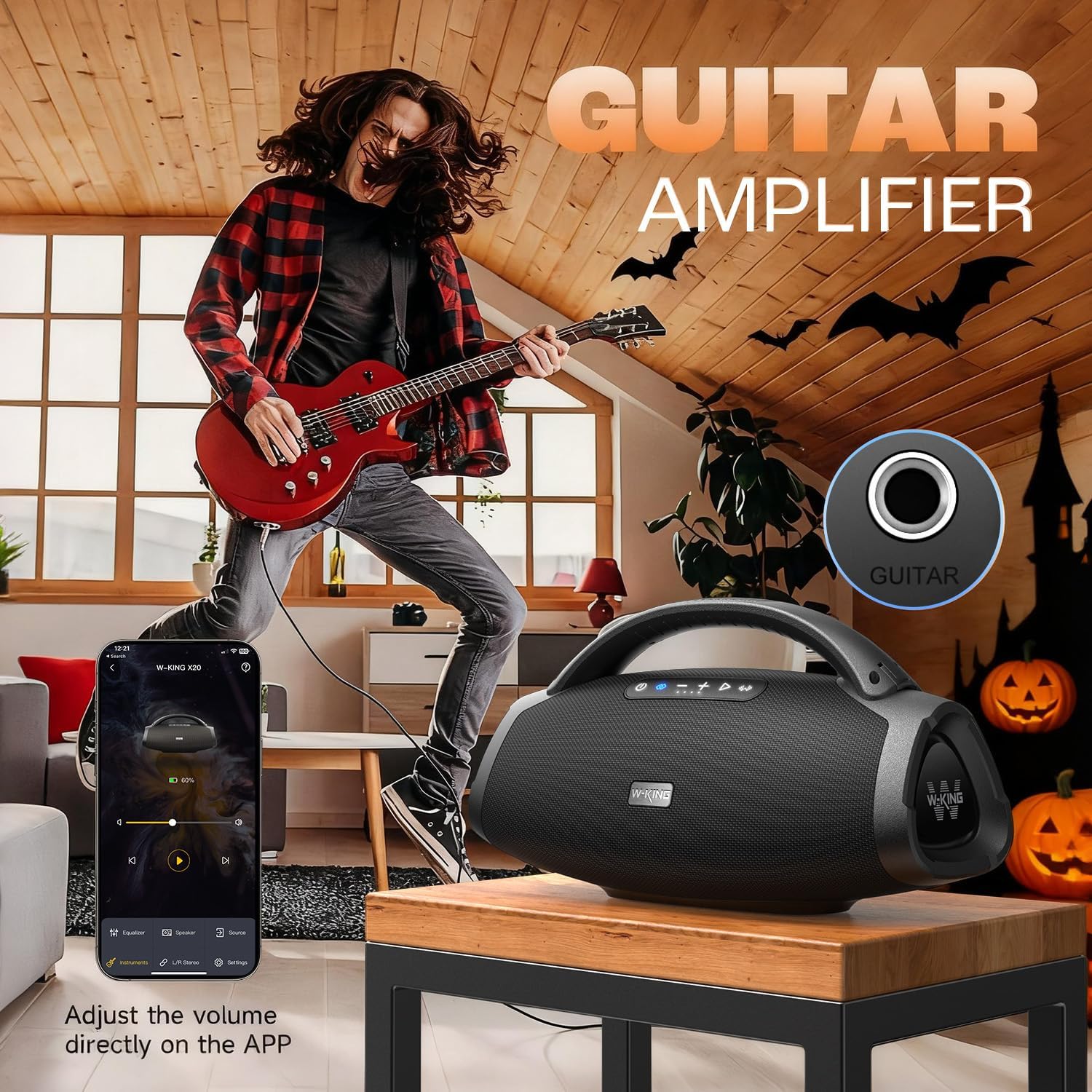 Hoofdtelefoon Monitor & Gitaar Input: Koptelefoons aansluiten op isolatie van externe ruis, X20 luide bluetooth-luidspreker reproduceren hoogwaardige en meeslepende audio-ervaring, zodat u de positionering van instrumenten en geluiden nauwkeuriger kunt waarnemen. De Guitar Input-functie van de luide bluetooth-luidspreker is perfect voor straatoptredens, kleine optredens of geïmproviseerde jamsessies. je kunt plug and play gitaar en genieten van het spelen met je favoriete backing tracks of liedjes. Geschikt als cadeau voor Halloween/Kerstmis/Nieuwjaarsdag