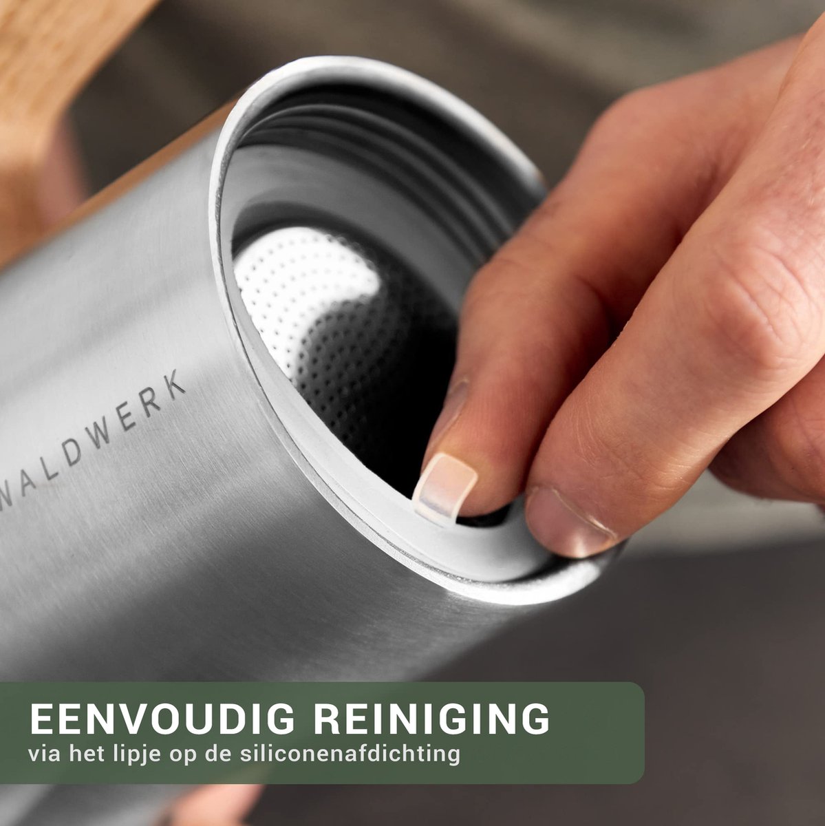 KINDERLIJK EENVOUDIGE REINIGING - dankzij het geïntegreerde lipje op de siliconen afdichting. Dit bespaart je het vervelende gepriegel bij het verwijderen. Bespaar tijd en zenuwen met je mokkapot van WALDWERK.