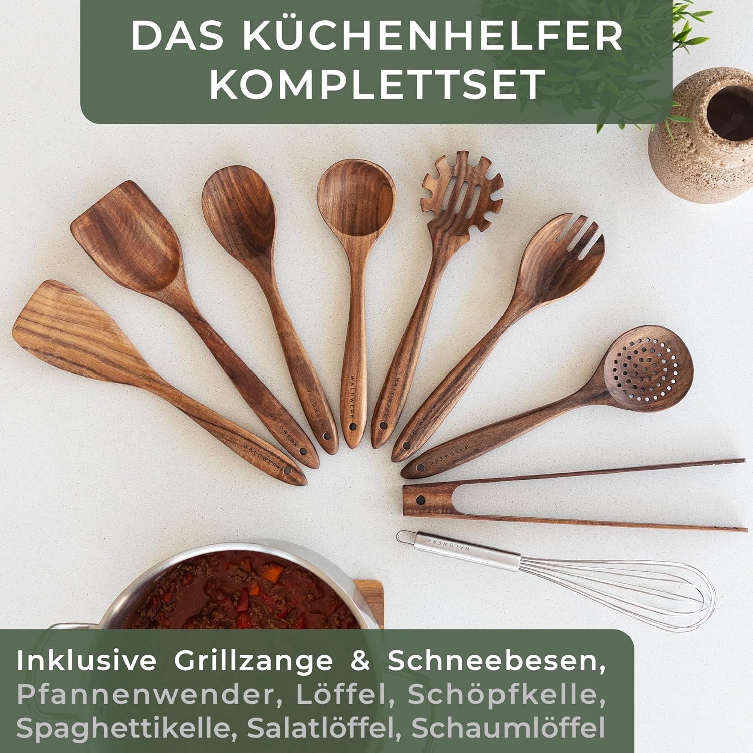 Gegarandeerd krasvrij: met de ergonomische houten spatels tover je moeiteloos op elke coating. De liefdevol vervaardigde houten kooklepels zijn de zachte metgezel voor je pannen.