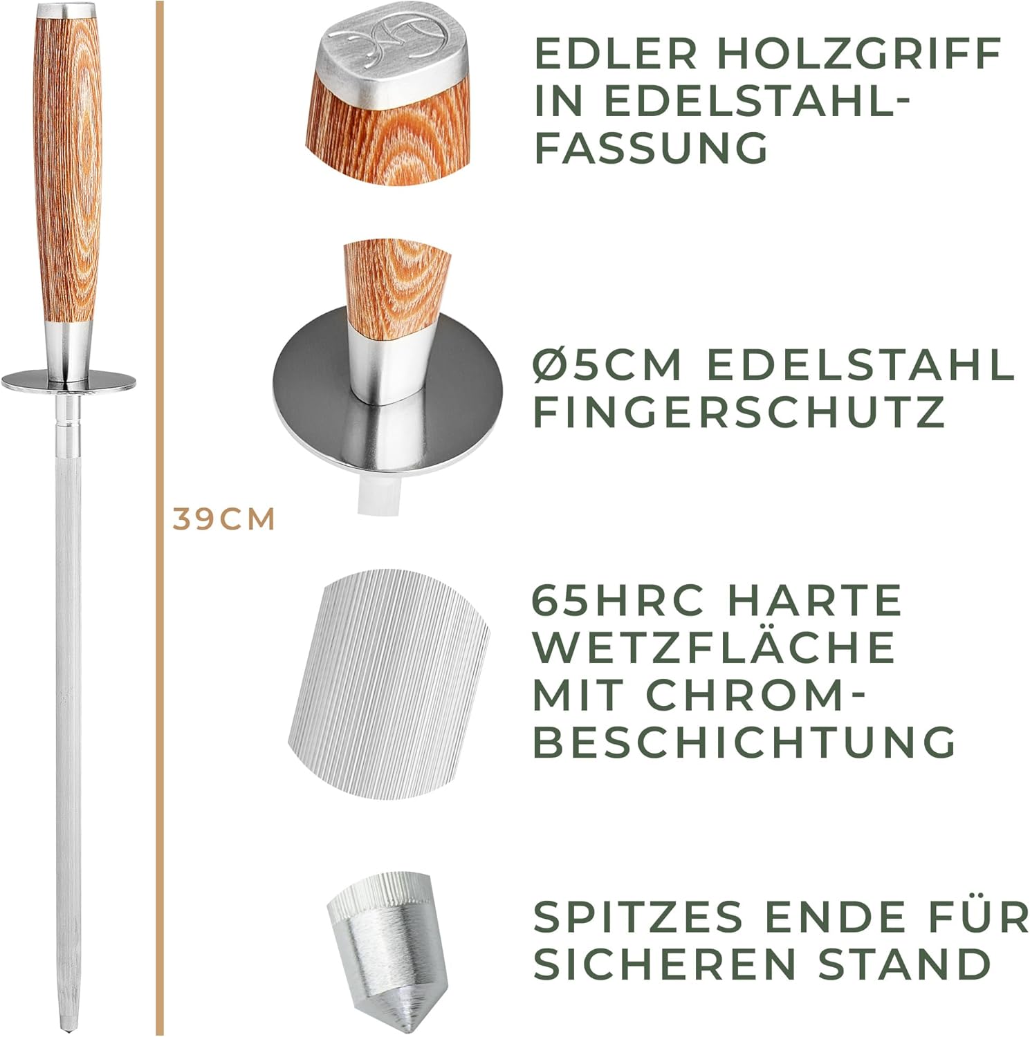 WALDWERK Premium aanzetstaal - messenslijper van gehard staal en met elegant houten handvat - 100% plasticvrij aanzetstaal voor messen - hoogwaardige messenslijper - messen slijpen als een