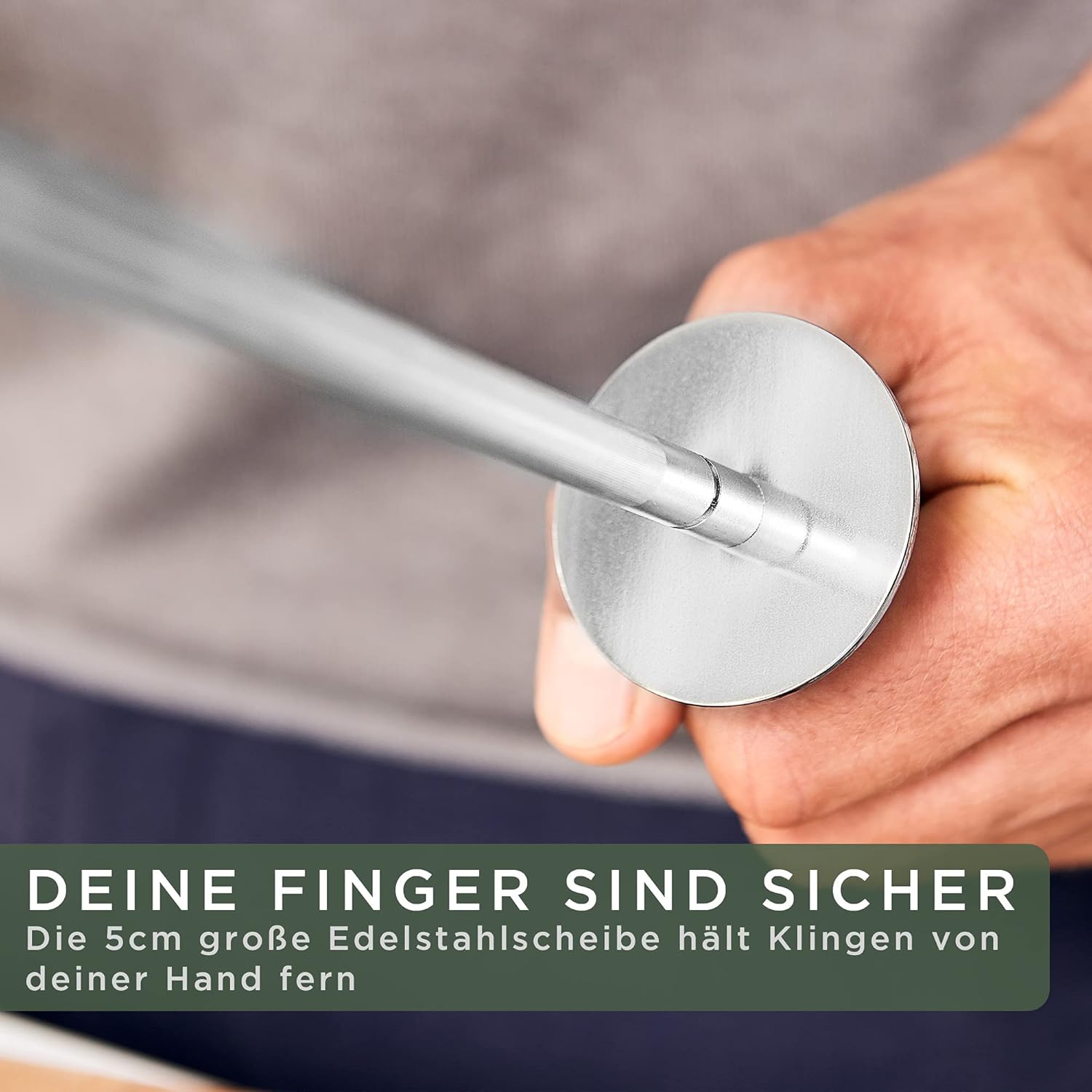 Extra grote vingerbescherming: het belangrijkste bij het slijpen van messen is dat je je niet verwondt. Daarom hebben wij een extra grote vingerbescherming ontwikkeld die je hele hand beschermt.