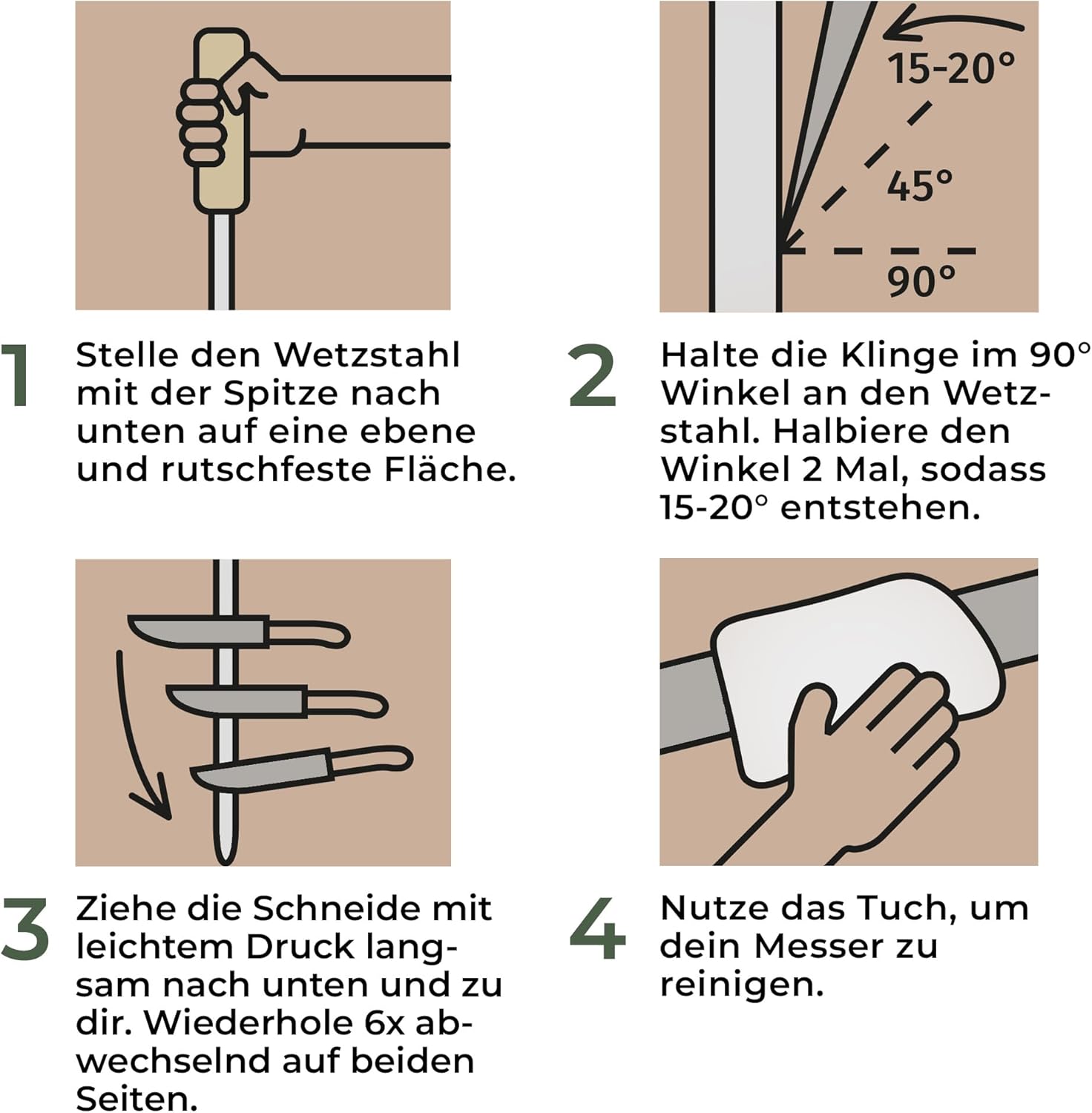 Eenvoudig in gebruik: dankzij de aangename houten handgreep ligt de messenslijper perfect in je hand. De punt van je wetstaaf is zo ontworpen dat je hem ideaal op tafel kunt ondersteunen.