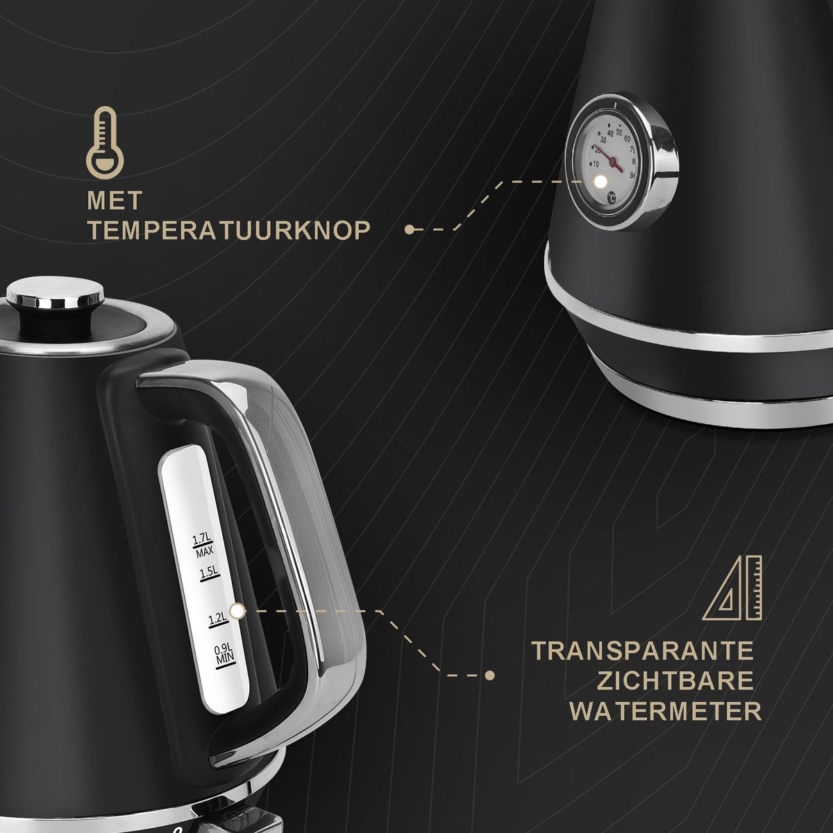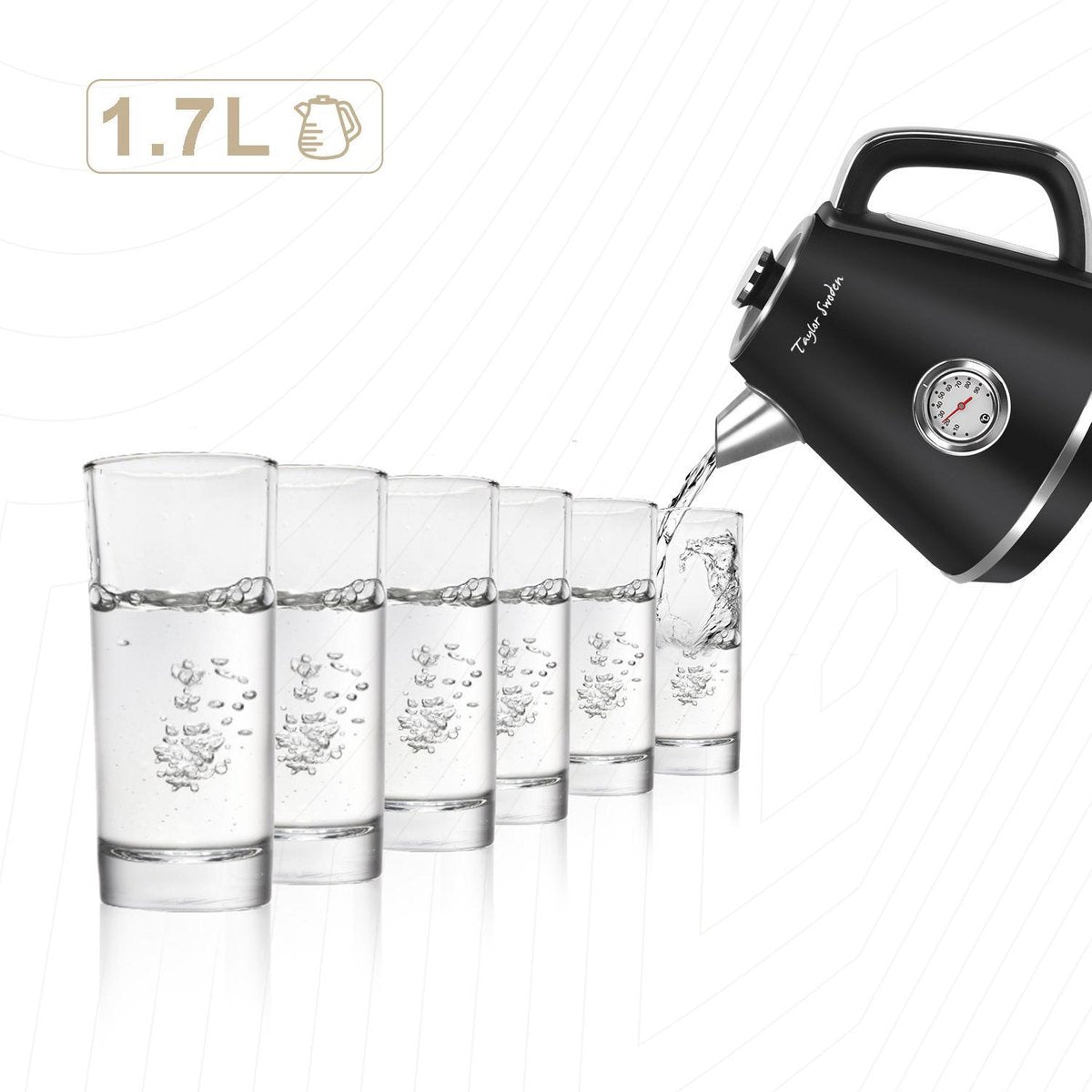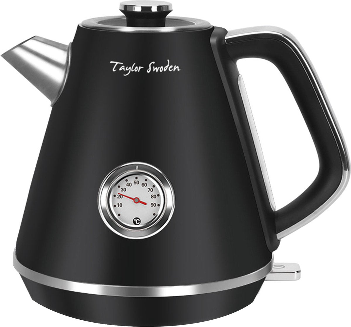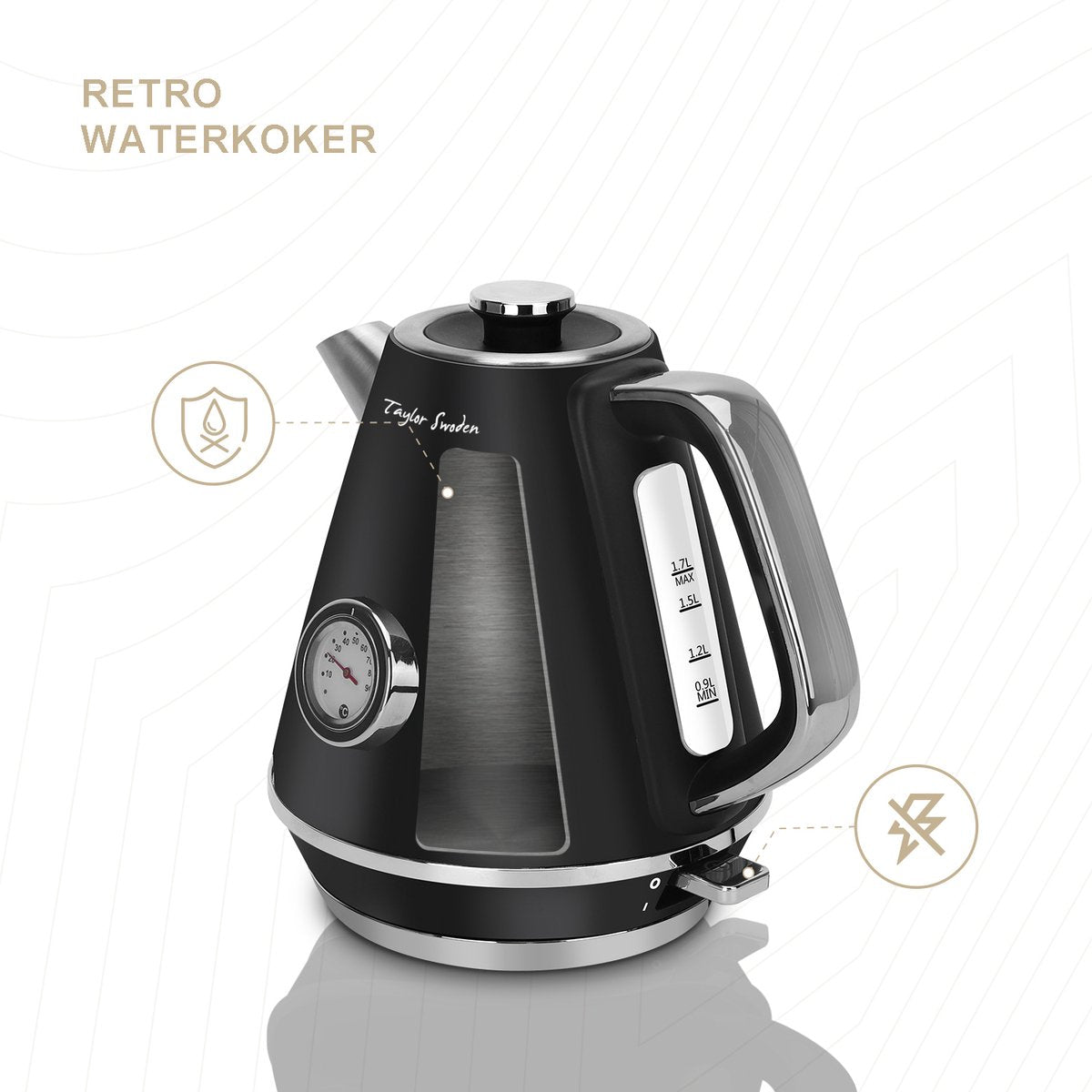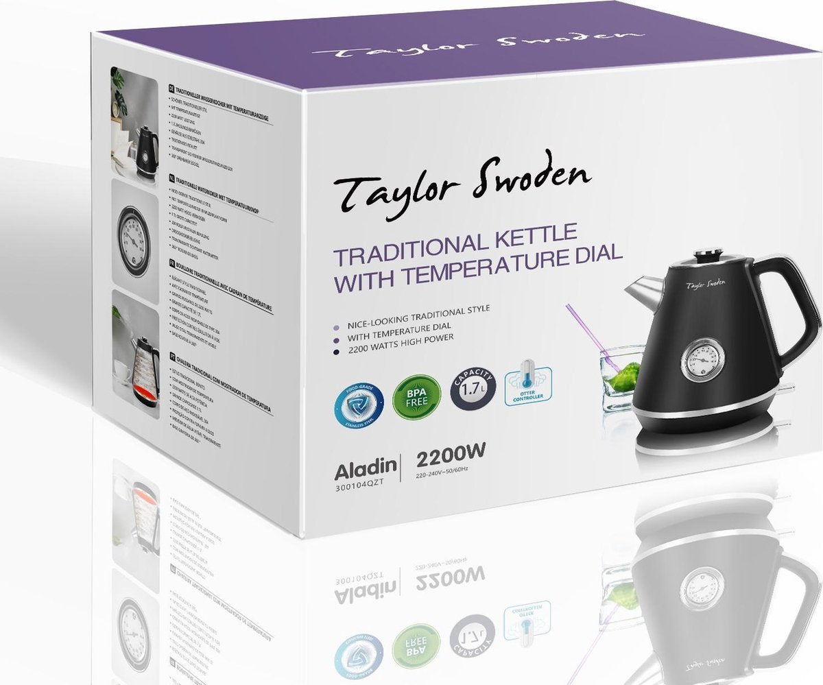 De Taylor Swoden Aladin is met zijn retro uiterlijk een echte blikvanger in de keuken. Op de geïntegreerde thermometer kun je aflezen hoe warm het water is. Met een inhoud van 1,7L zet je snel en eenvoudig voor 7 personen thee en met de handige waterniveaumarkering, meet je eenvoudig de juiste hoeveelheid water af. De ingebouwde thermostaat laat het water volledig koken en schakelt zich vervolgens automatisch uit. Daarnaast wordt veiligheid gewaarborgd door de droogkookbeveiliging. Als er te weinig water in de waterkoker zit, schakelt deze uit voor het water kookt.
