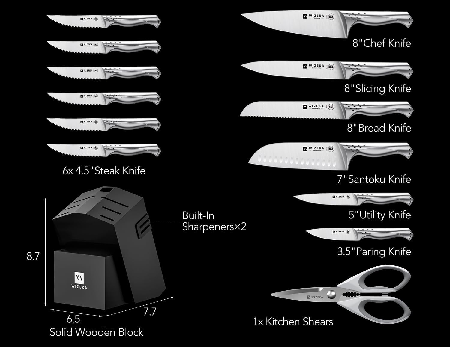 WIZEKA Keukenmessenset met blok: Razor Sharp 15-delige professionele koksmessenset met messenslijper, messenblokset van Duits roestvrij staal voor levensmiddelen, Jaguar-serie