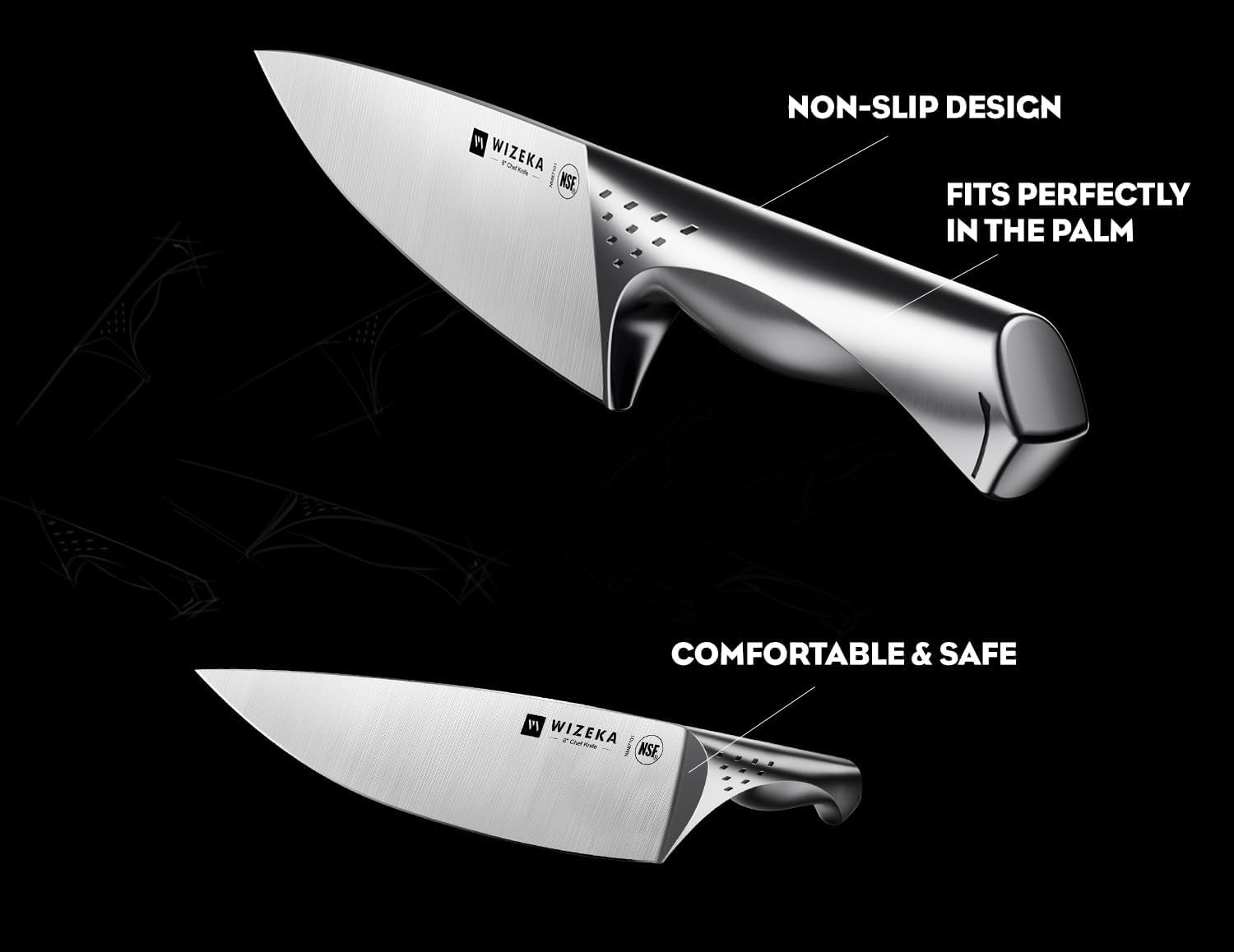 Comfort Grip: Ergonomisch ontworpen met een volledig gesmede bolster voor een naadloze overgang van het mes naar de handgreep, wat zorgt voor uitzonderlijke duurzaamheid, balans en veiligheid. De antislip handgreep past perfect in uw handpalm en omsluit uw vingers.