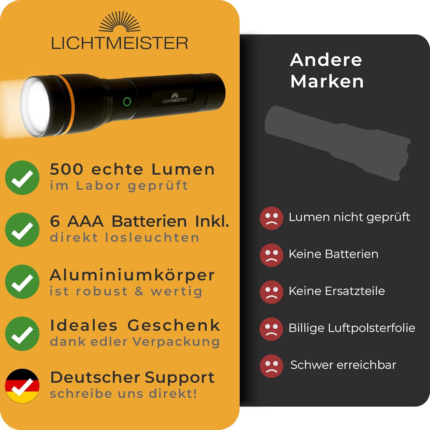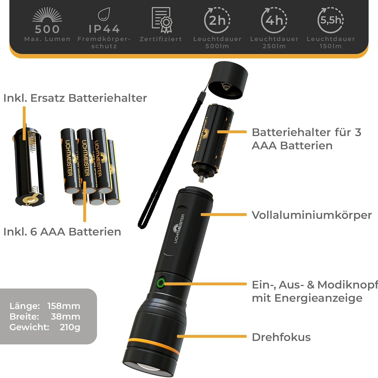 Extreem helder: dankzij 500 lumen wordt de nacht een dag als je je zaklamp van LICHTMEISTER aanschouwt.