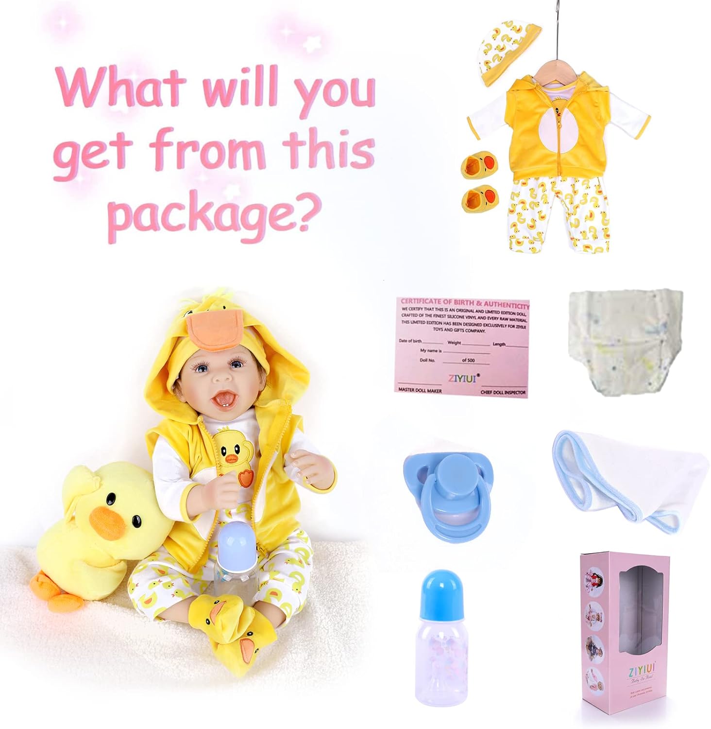 Reborn poppenset bevat: 1 x Reborn babypop, 1 x poppenkleding, 1 fles, 1 x geboorteakte, 1 geschenkdoos, 1 x kleine mat, 1 x luier.