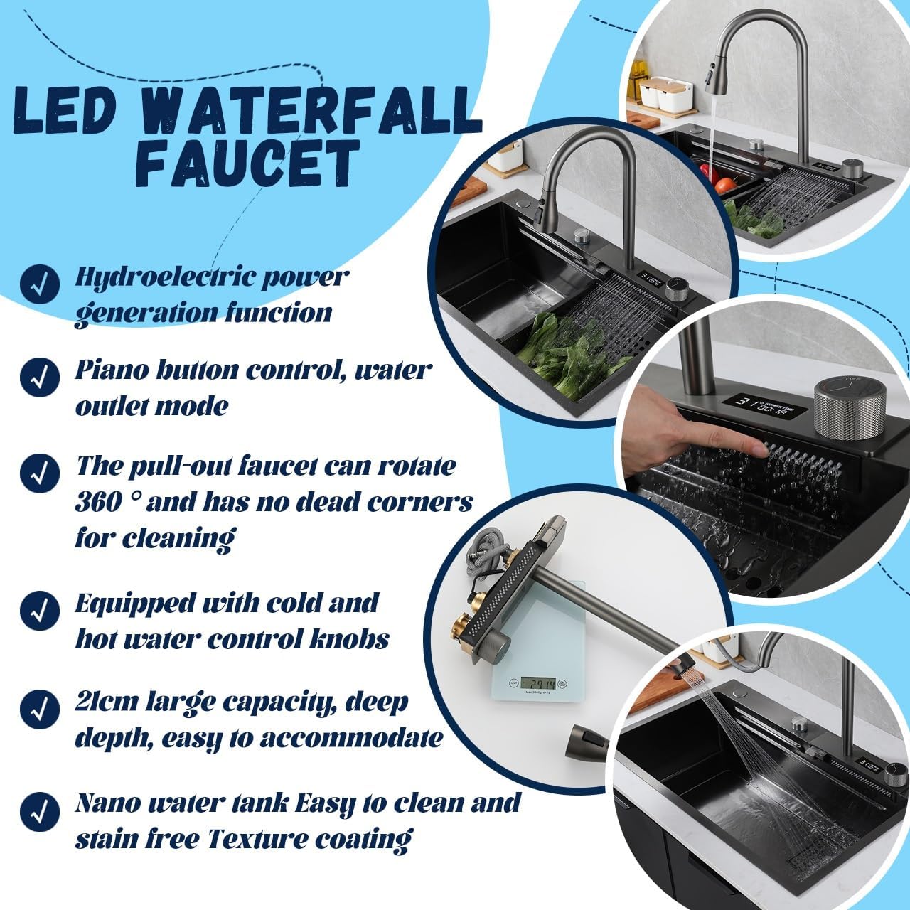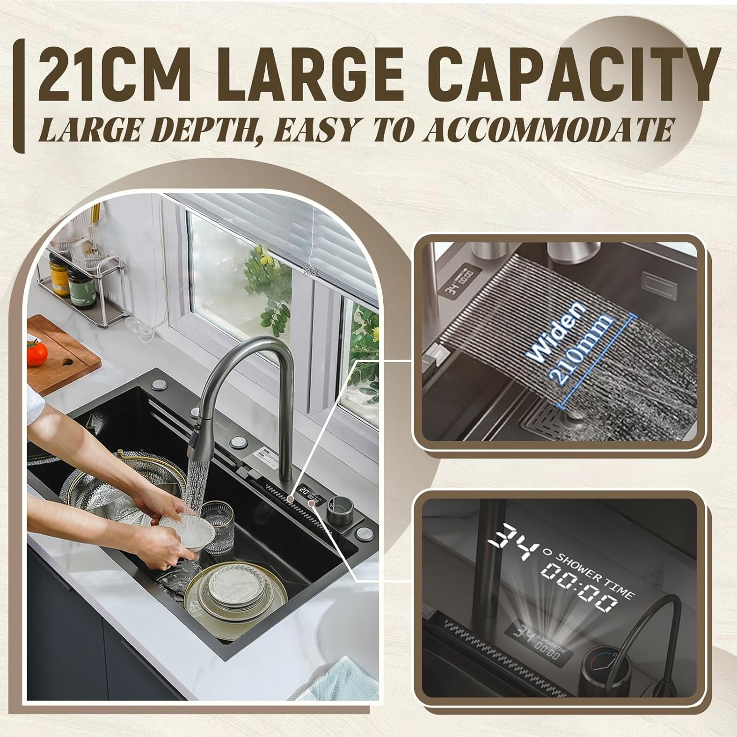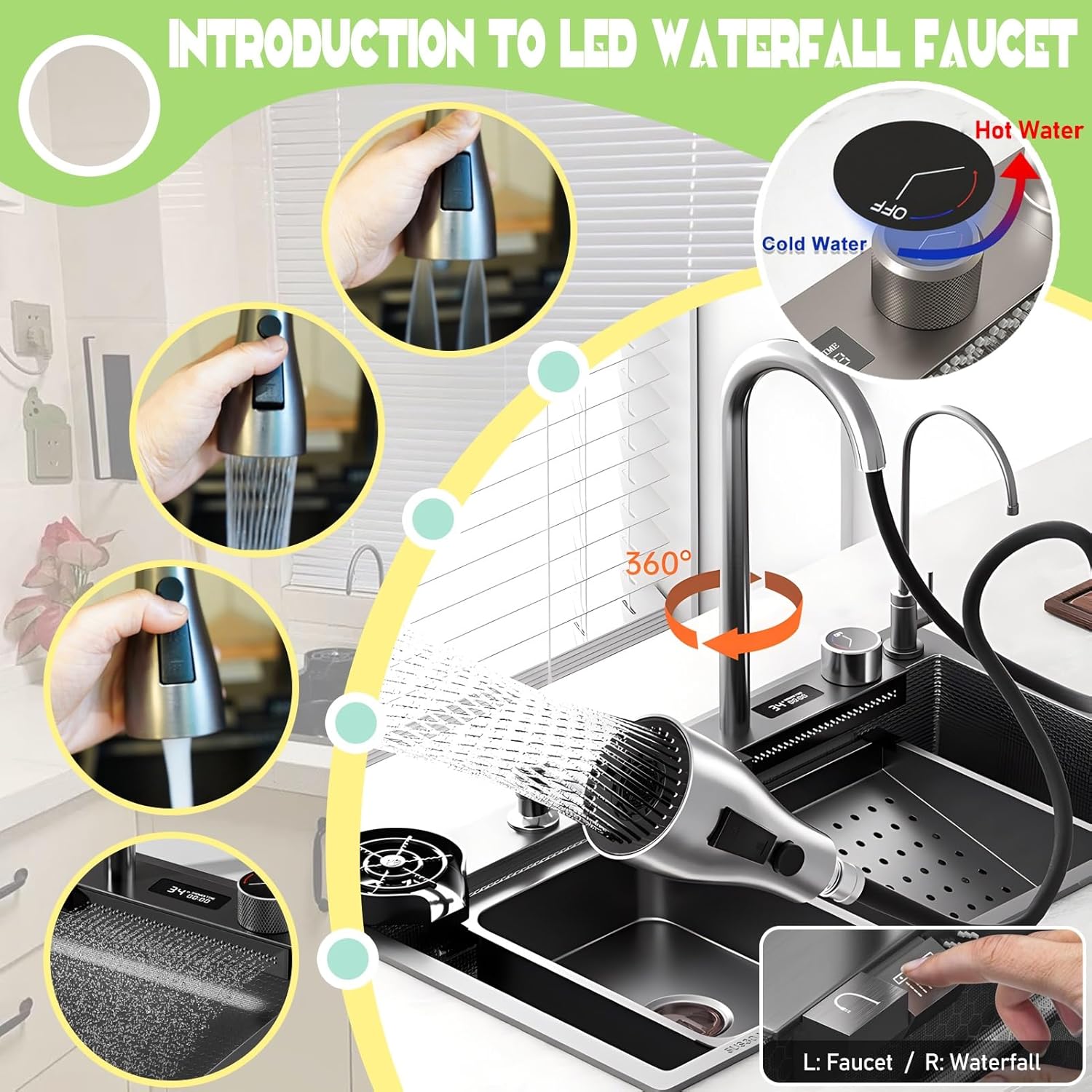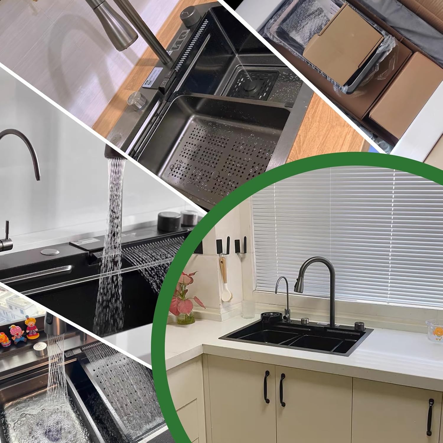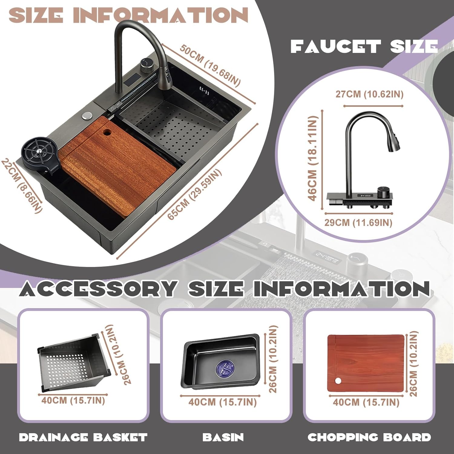All-in-one werkspoelset: deze keukenspoelset bestaat uit een nano-roestvrij stalen wastafel, een ultramoderne watervalkraan met digitale temperatuurweergave, een multifunctioneel afvoersysteem, een snijplank, een driehoekige afdruipmand, een hogedrukbekerwasmachine en belangrijke reinigingsaccessoires. Elk onderdeel is veilig verpakt met slagvast schuim, wat een veilige levering en een complete keukenuitrusting garandeert.